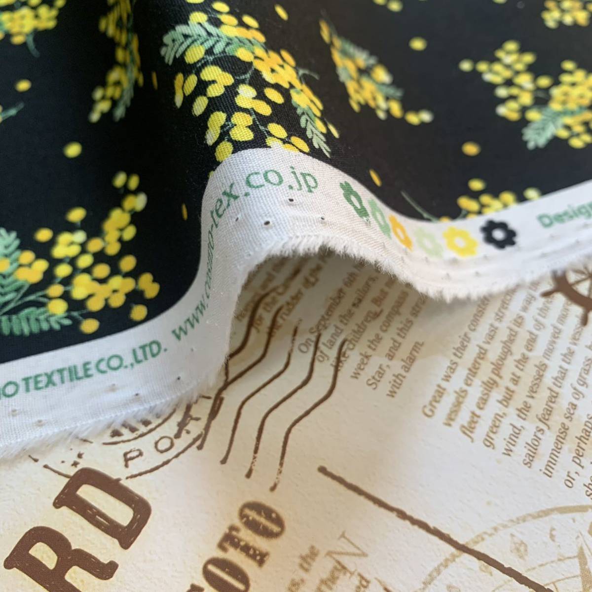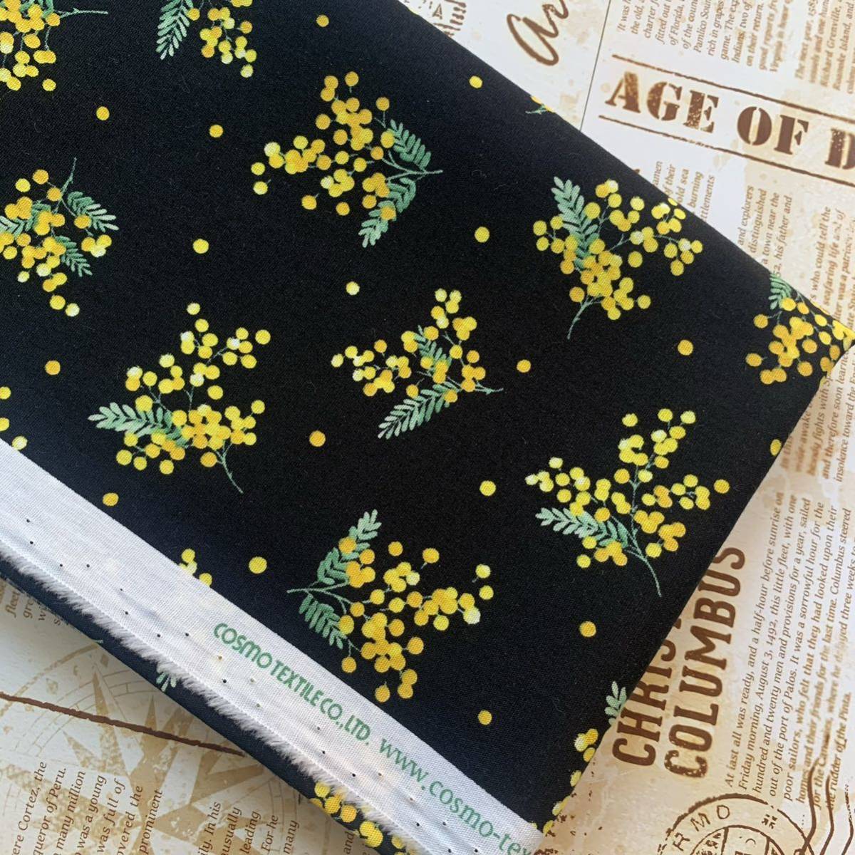 ブロード*風に揺れる黄色いミモザの花*黒*110×50cm