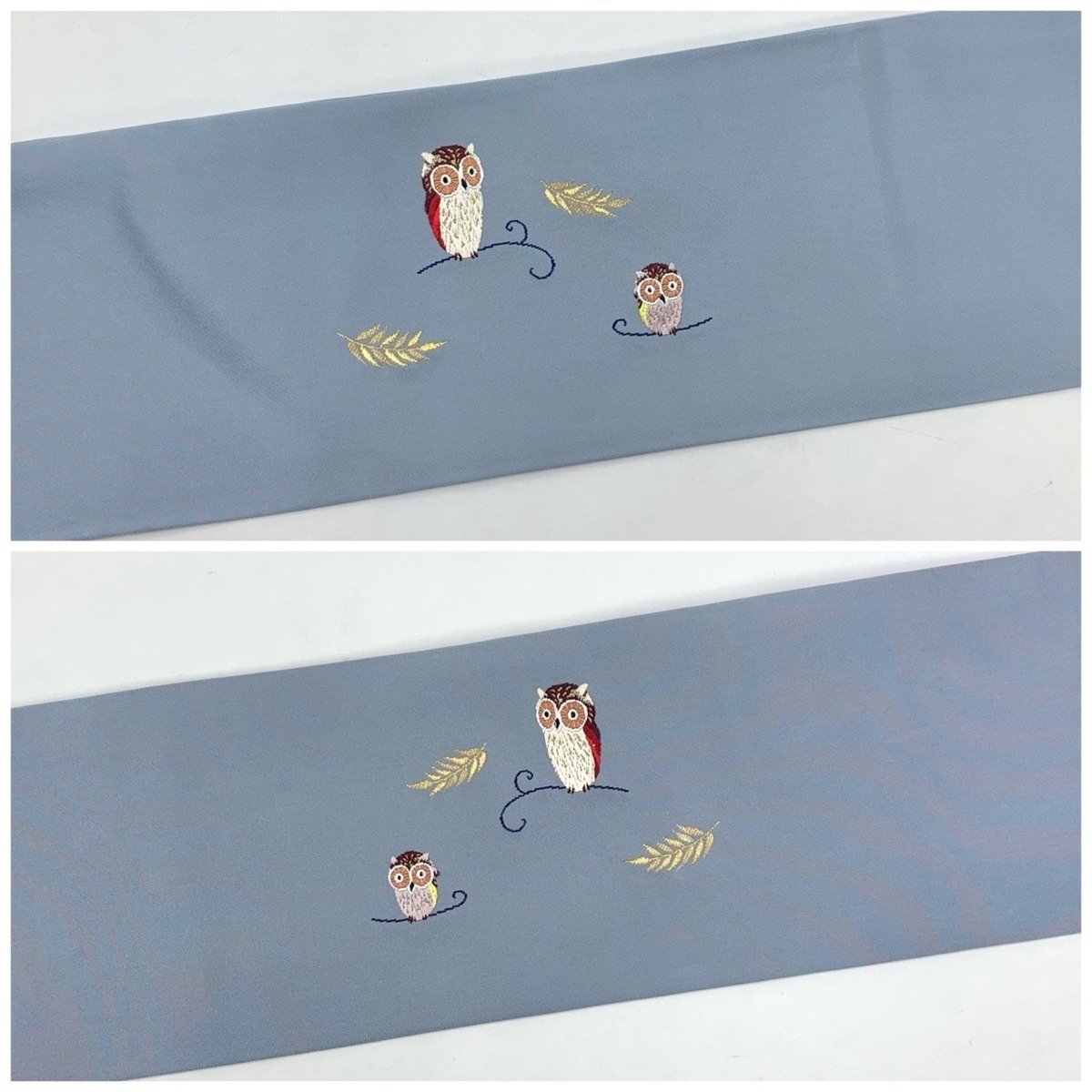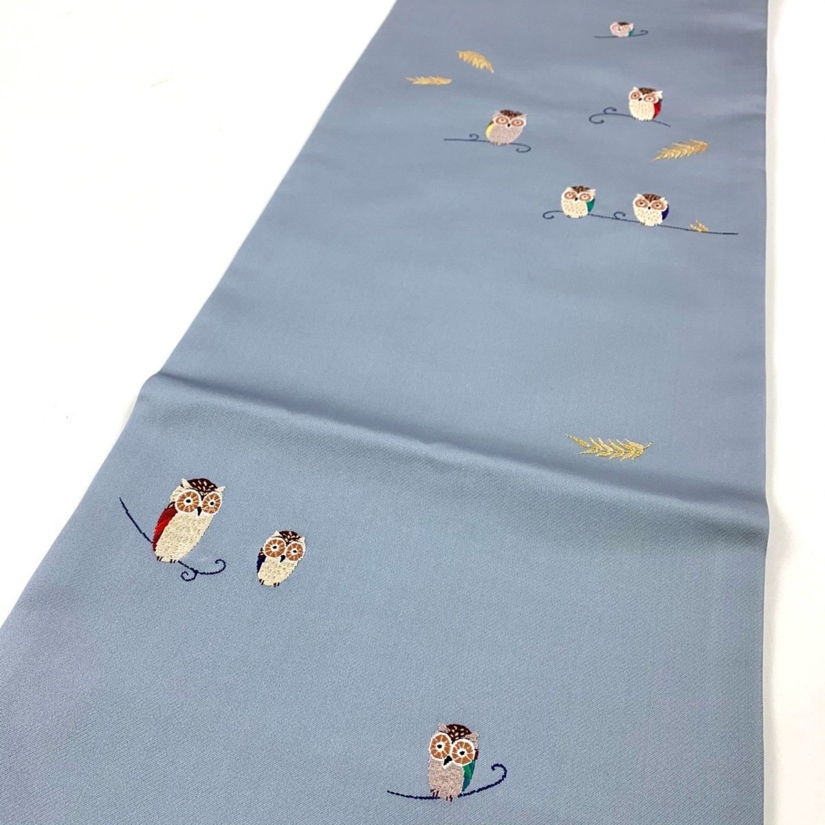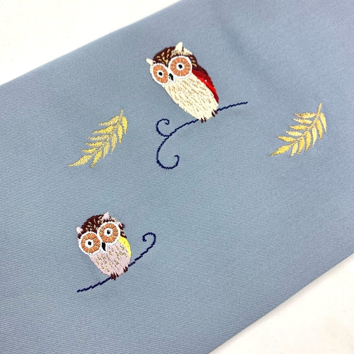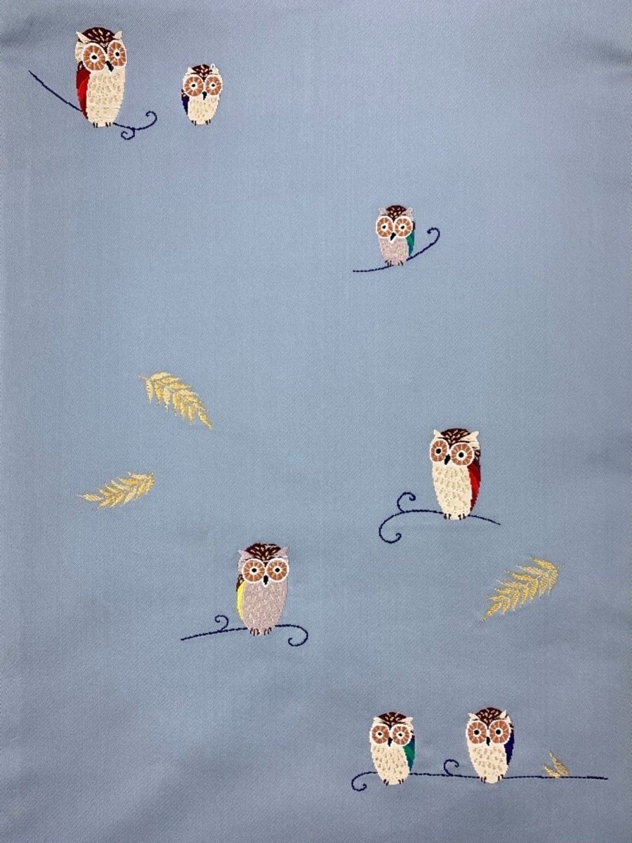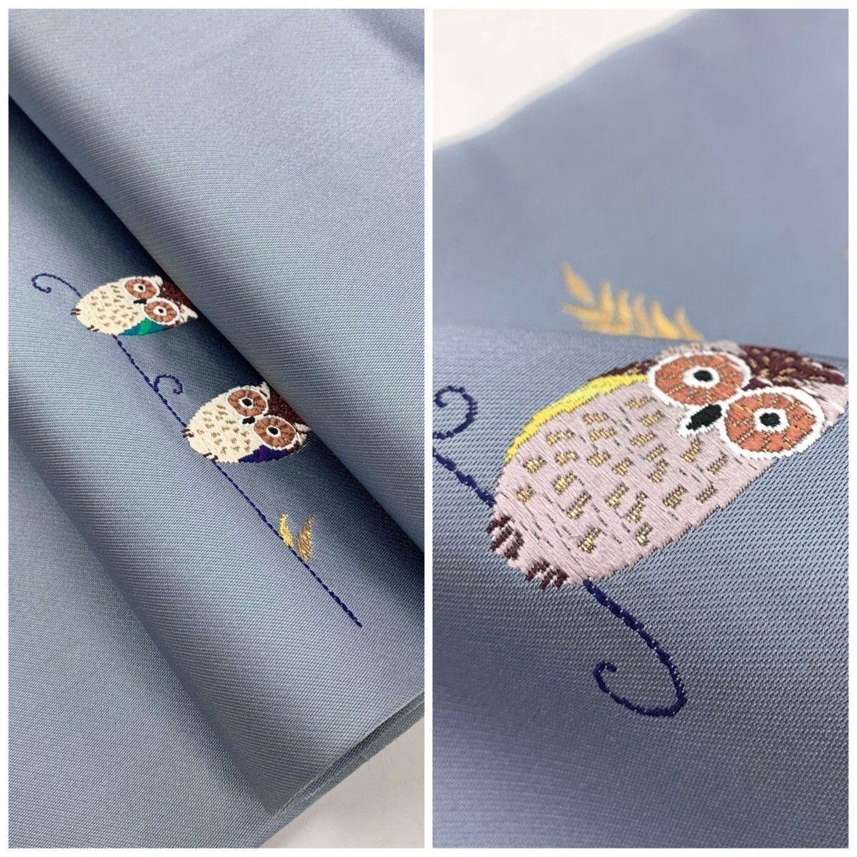 落ち着いたグレーがかった水色の地に織り出された、可愛らしいふくろうの意匠。