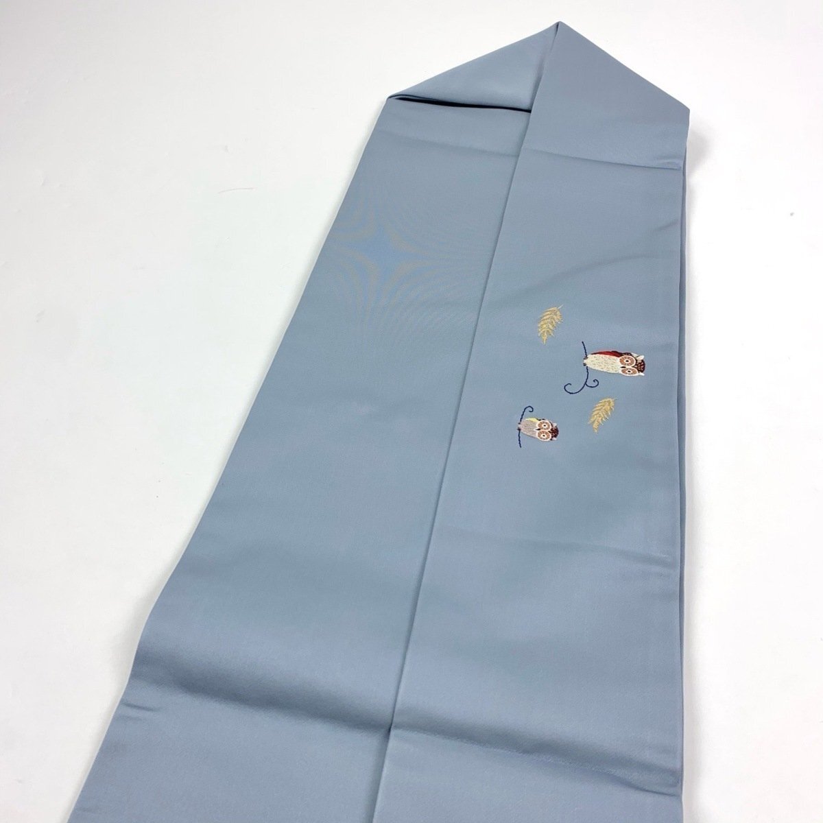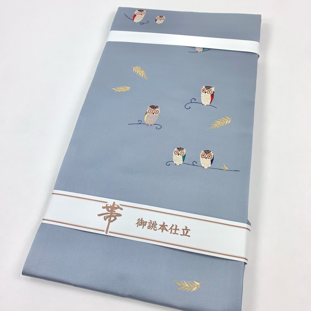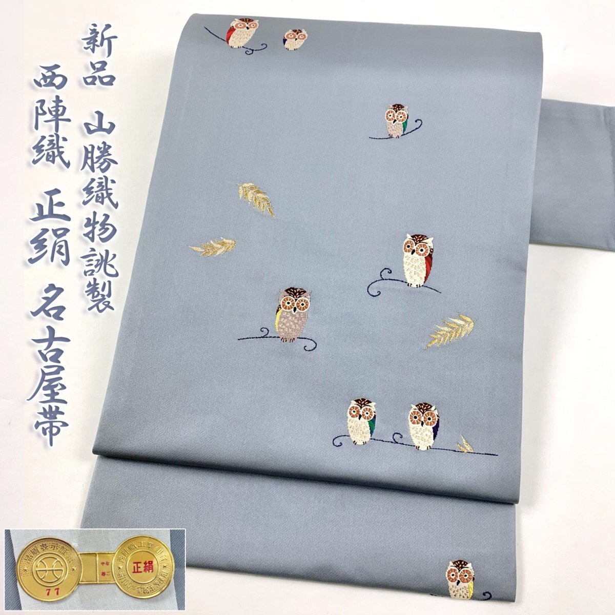 着物さと 新品 名古屋帯 西陣織 正絹 森の梟 フクロウ ふくろう 縁起物 水色 ブルーグレー 紅掛空色 モダン