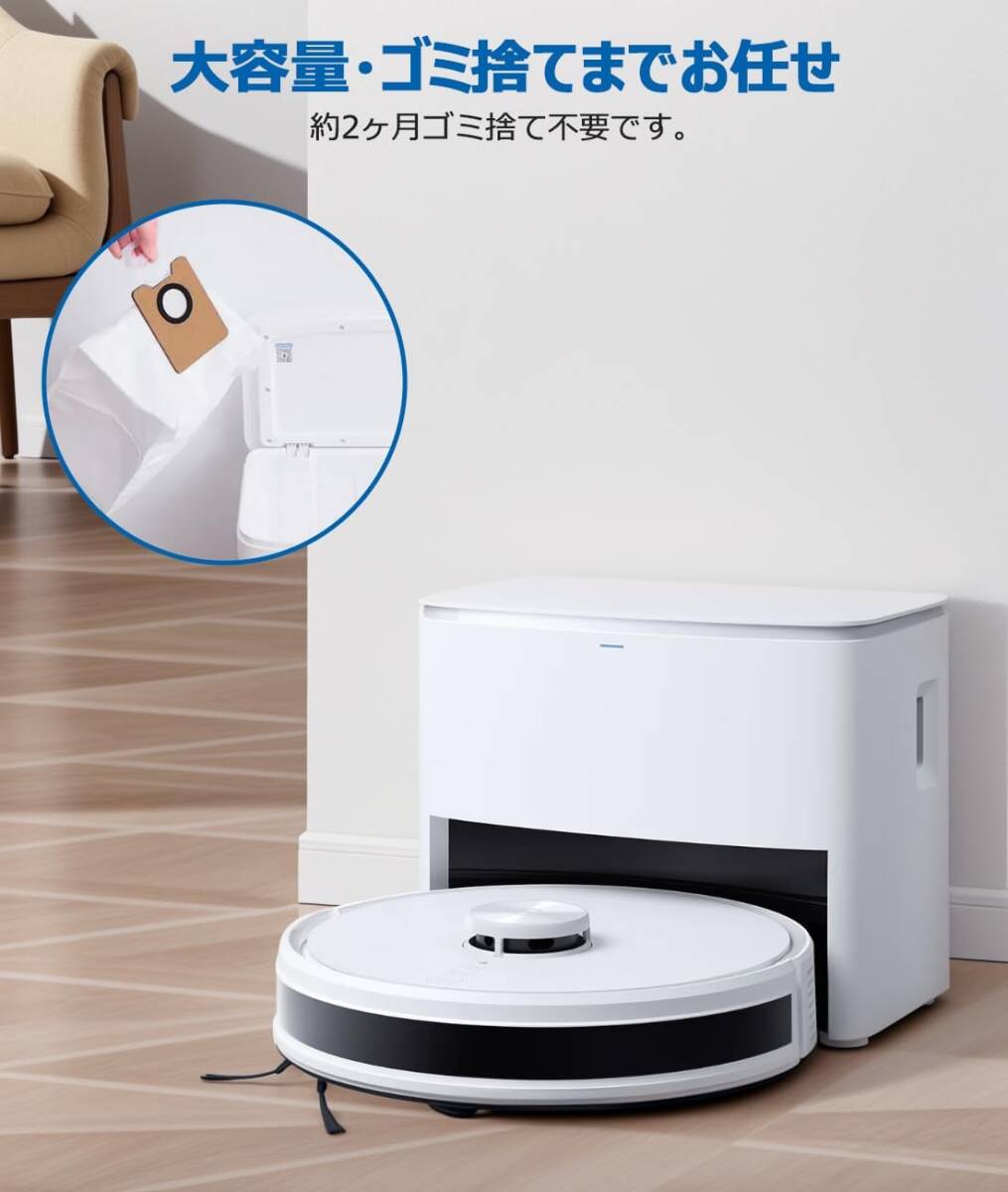【自動でゴミを収集する】Eufy 紙パックが自動でゴミを収集する「クリーンベース」に対応しています。掃除が完了するとロボット掃除機が吸い込んだゴミをクリーンベース内にある紙パックに自動で排出します。ゴミに潜む細菌、ウィルス、花粉、ダニなどの粒径0.1μm以下の超微小粒子状物質も99.99%をしっかり集めます。