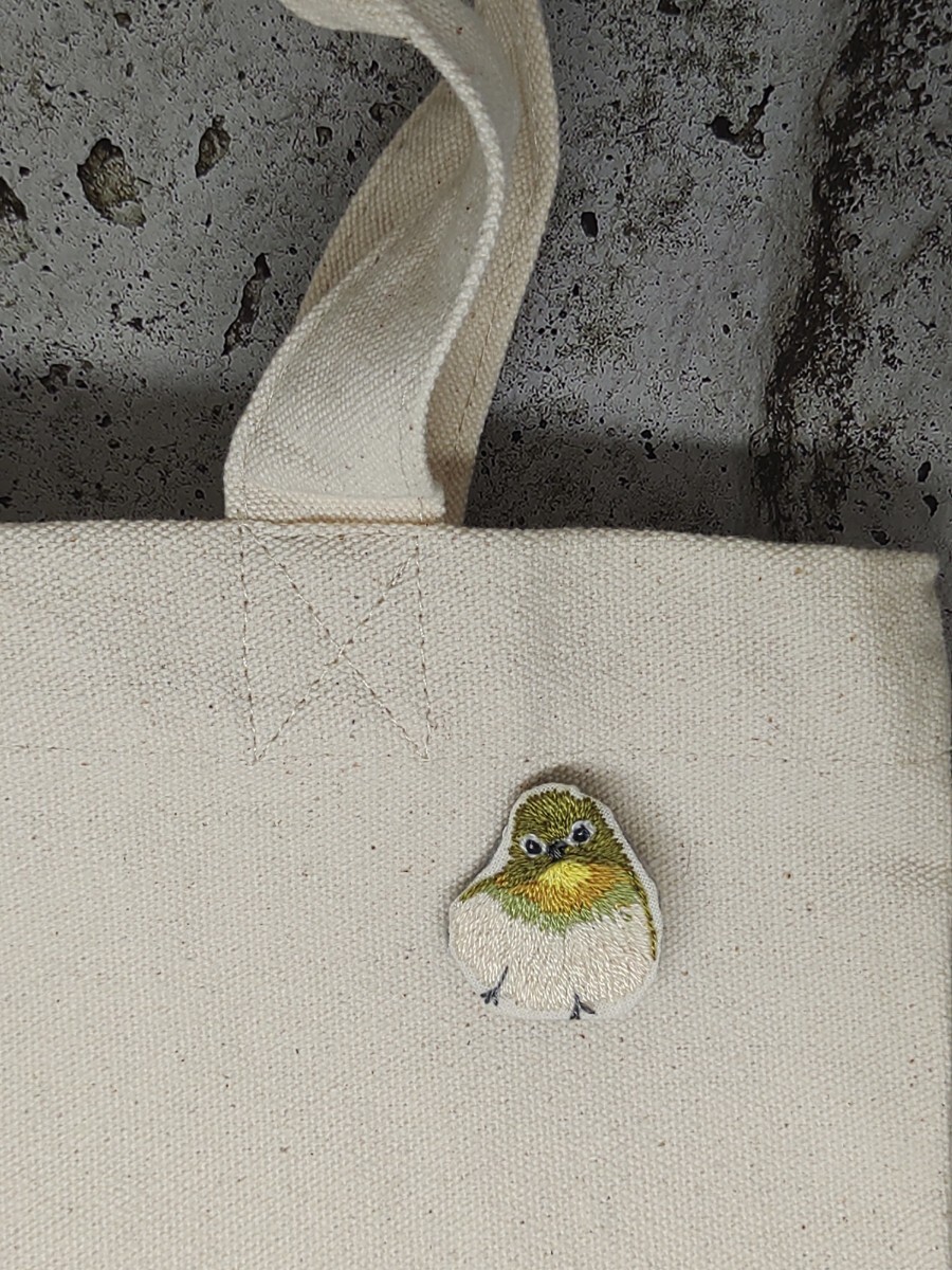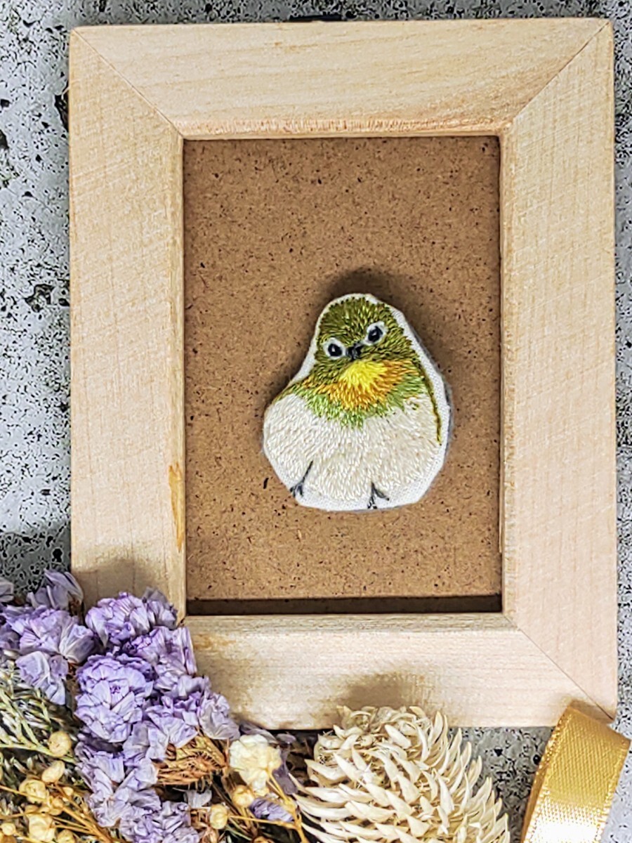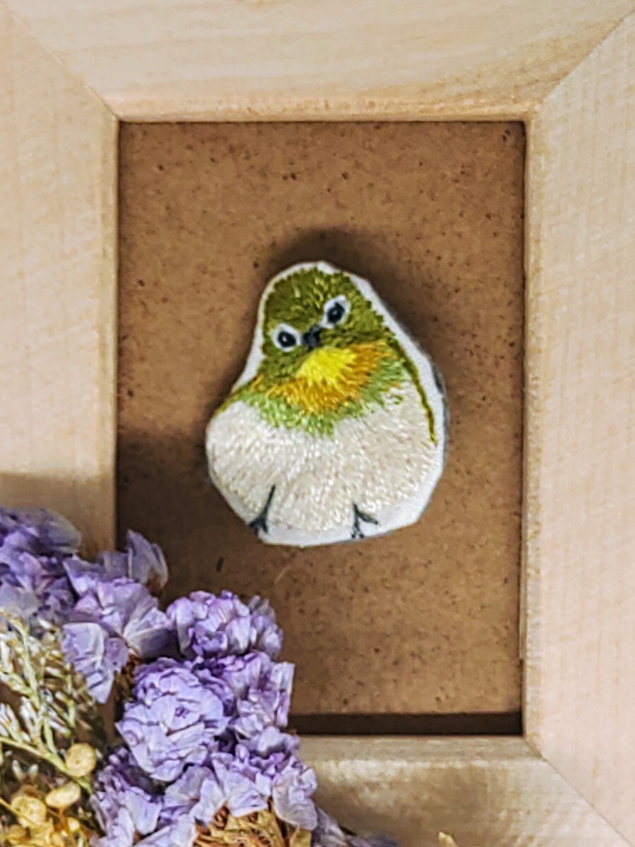 身近な小鳥で昔から愛されてきたメジロを一針一針丁寧に手刺繍しました。