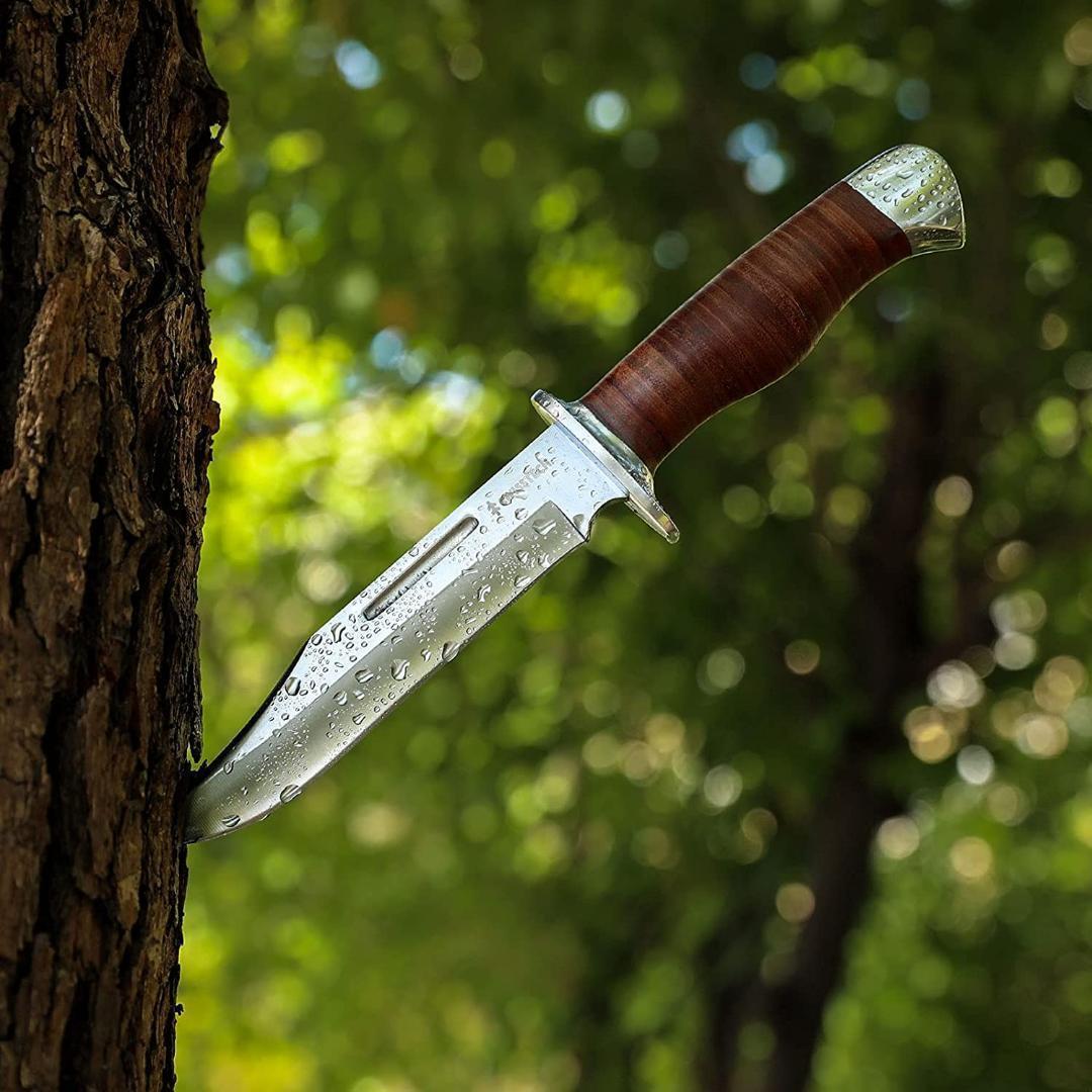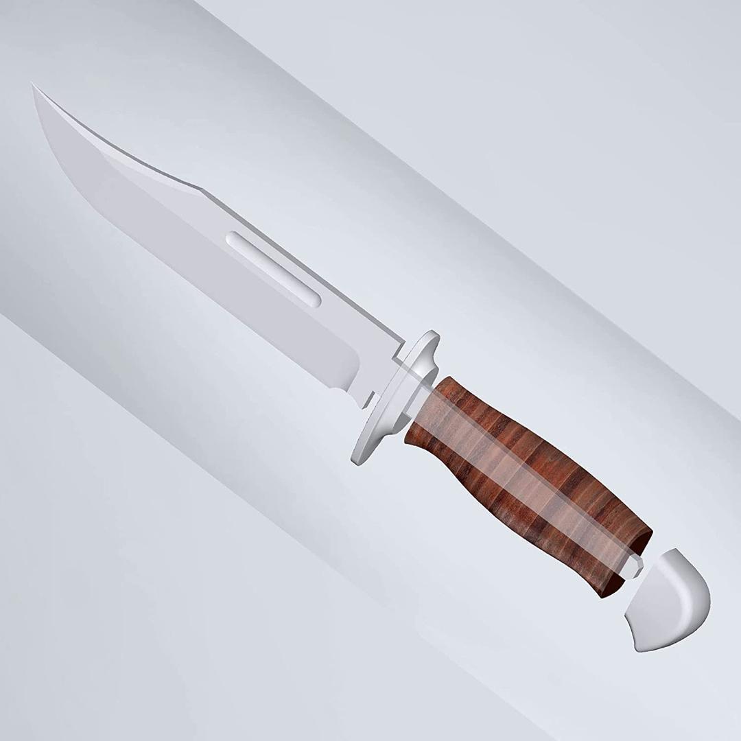 【仕様】全長:約26cm、刃渡り:約14cm、刃厚み(付け根部):約4mm、重量:170g、ブレード材質:ステンレス(3CR13)、グリップ材質:芯はステンレス鋼で、外は牛革です。