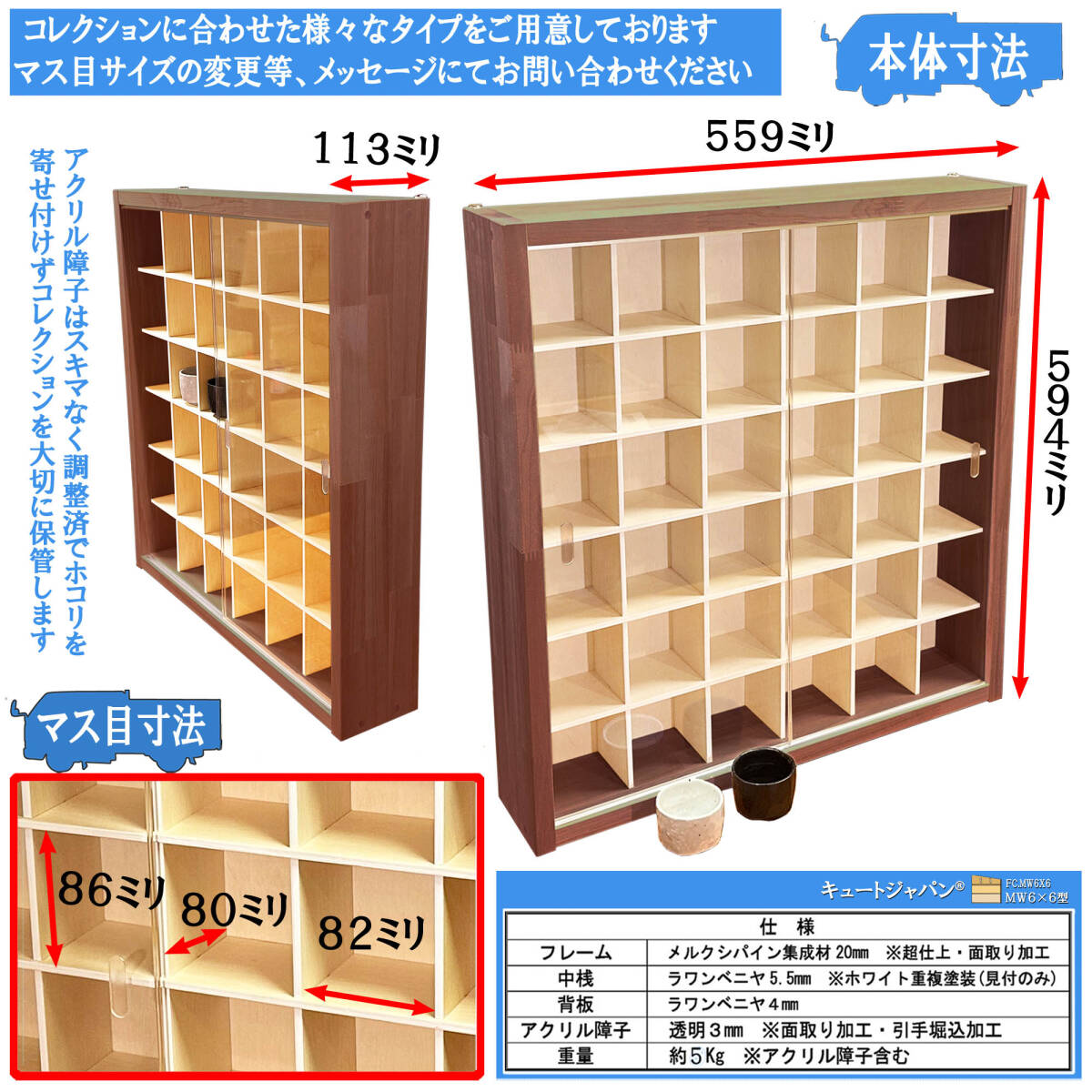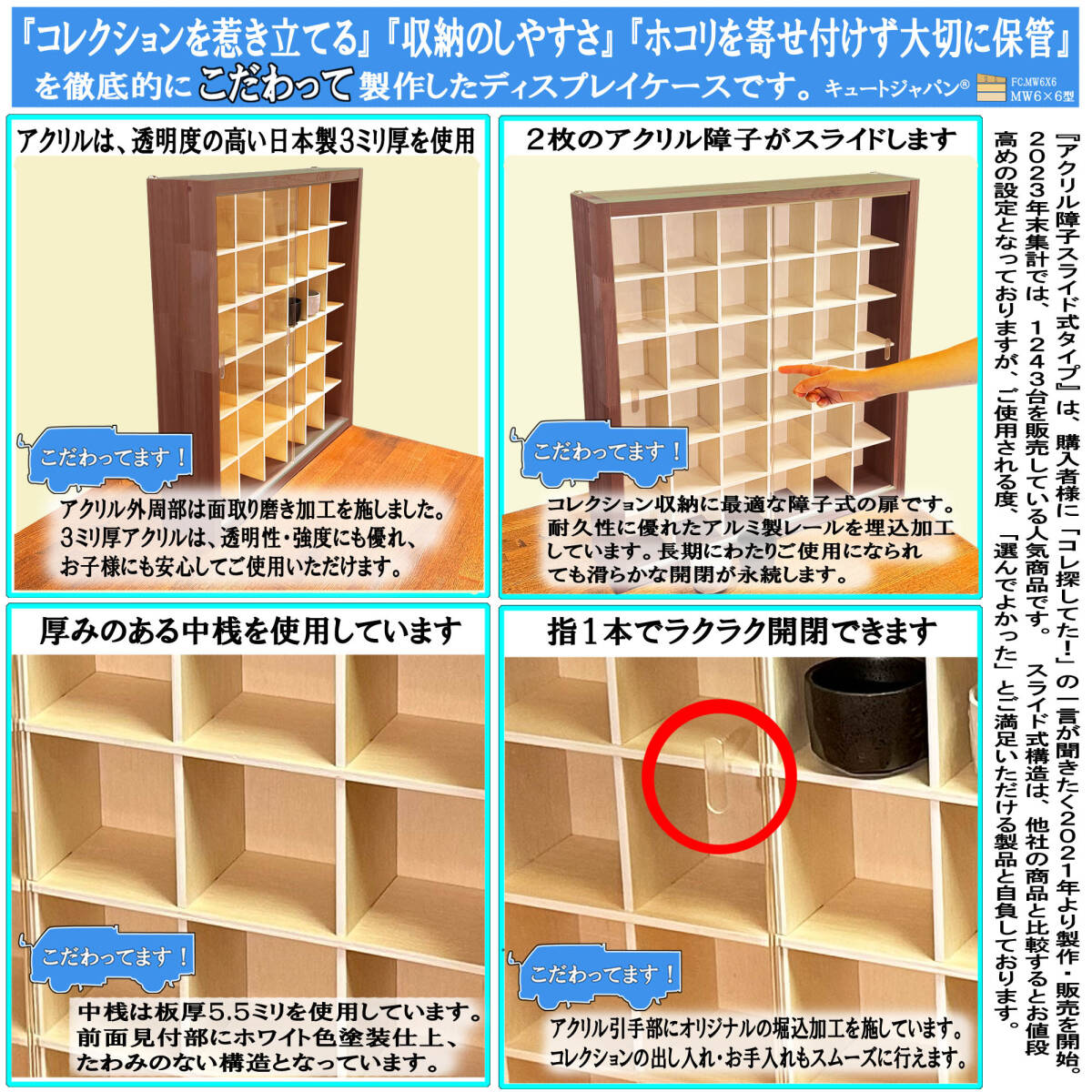 アクリル障子は透明度が高く、大切なコレクションをホコリや傷から守ります。