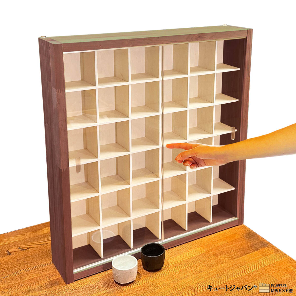 おちょこが36個収納可、コレクションを惹きたてるディスプレイケースです。