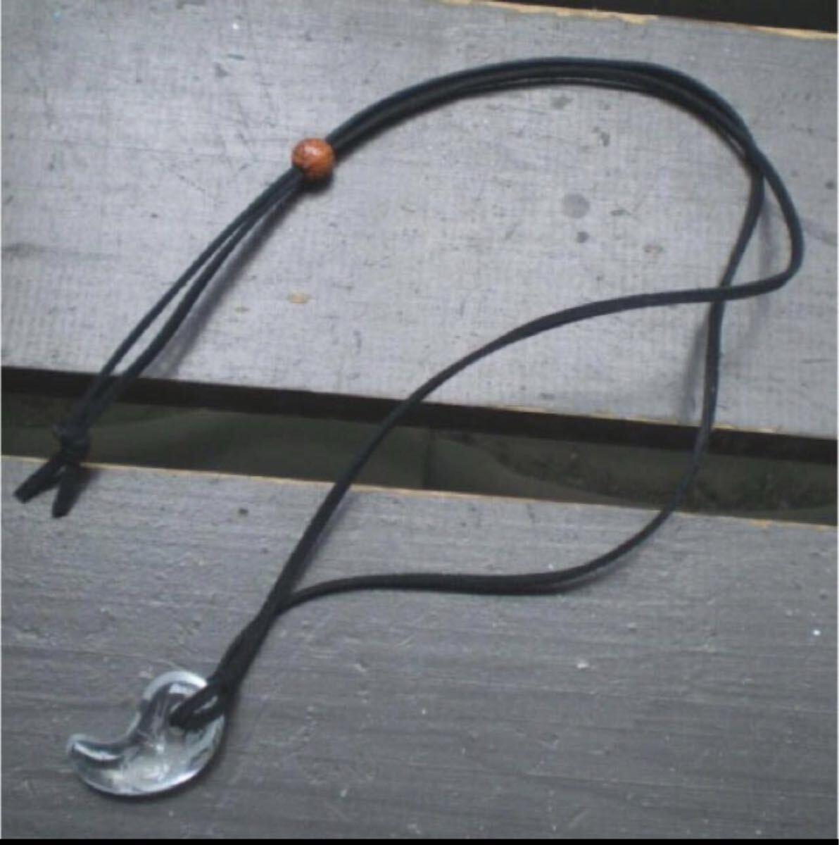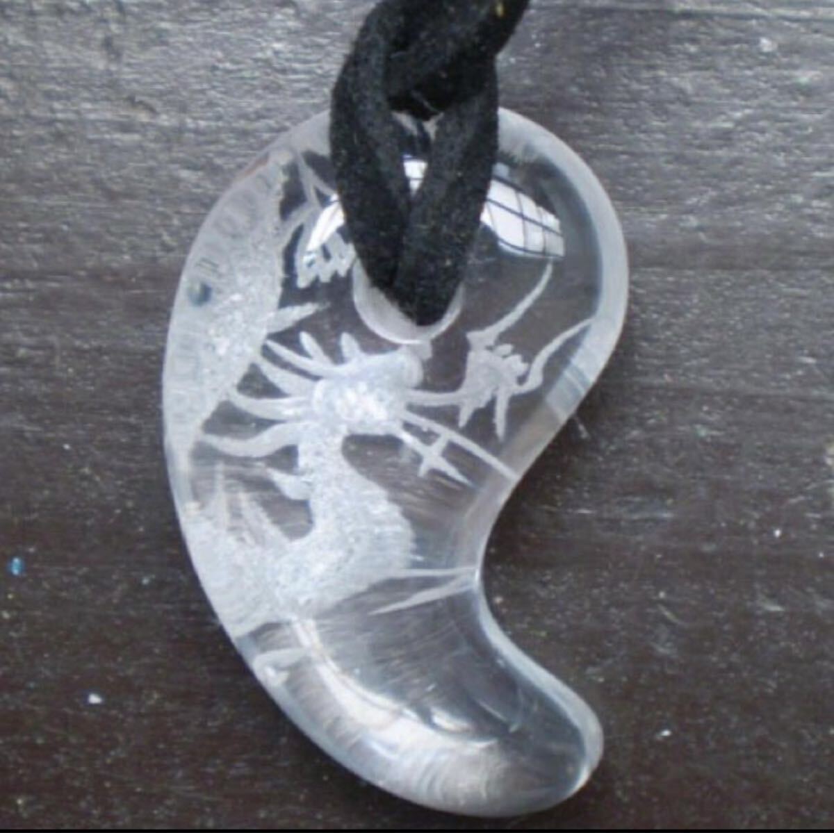 龍が手彫りされた水晶勾玉を皮紐に通し、ボーンビーズで長さの調整ができるようにしております。