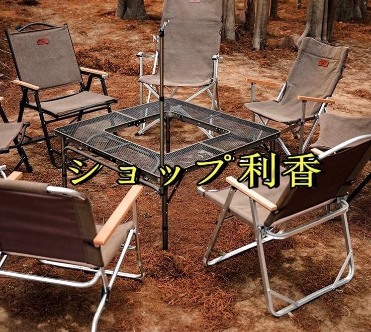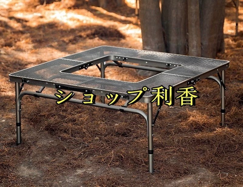 アイアン囲炉裏テーブル メッシュ 焚き火テーブル 着脱式センターテーブル付き 2つ折りコンパクト収納 調理ツール BBQアウトドア ブラック