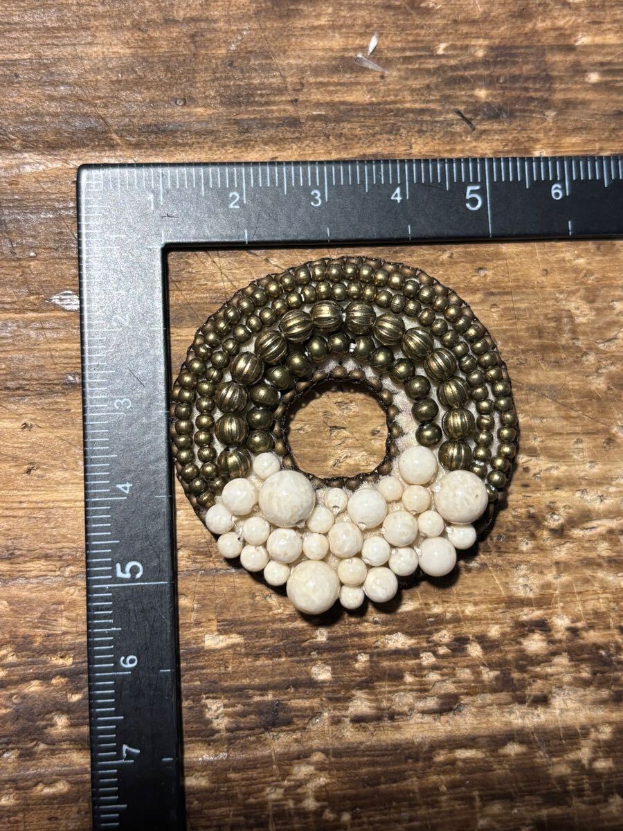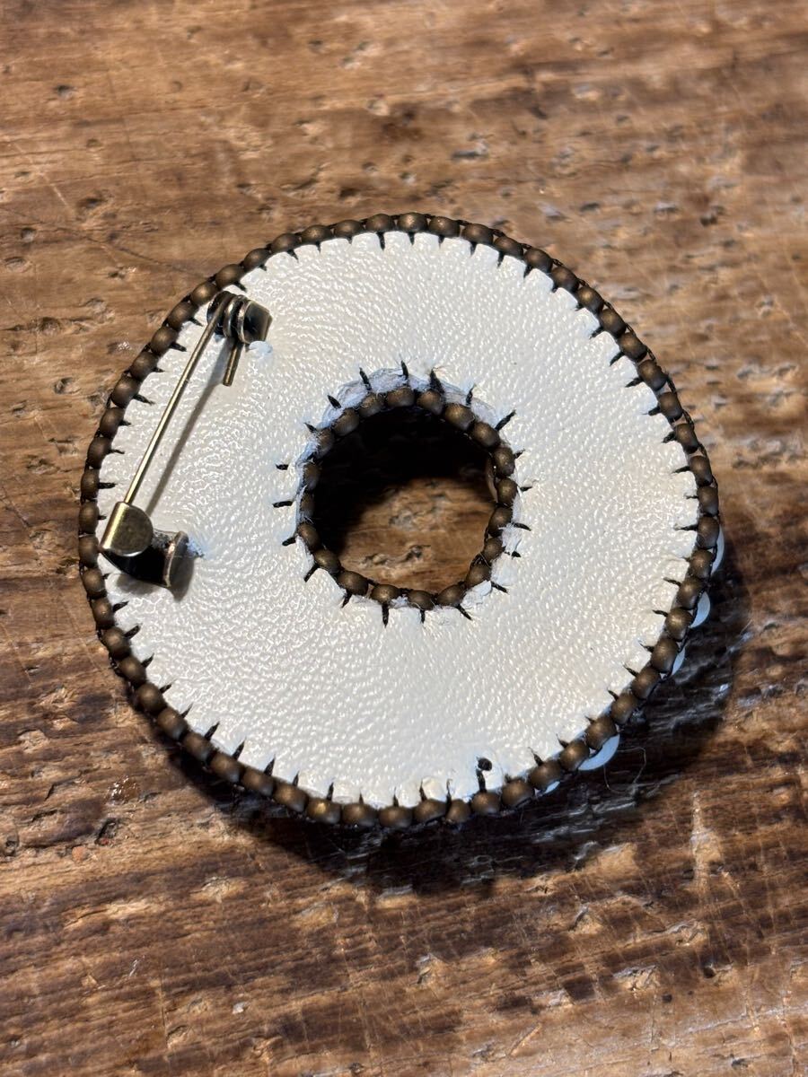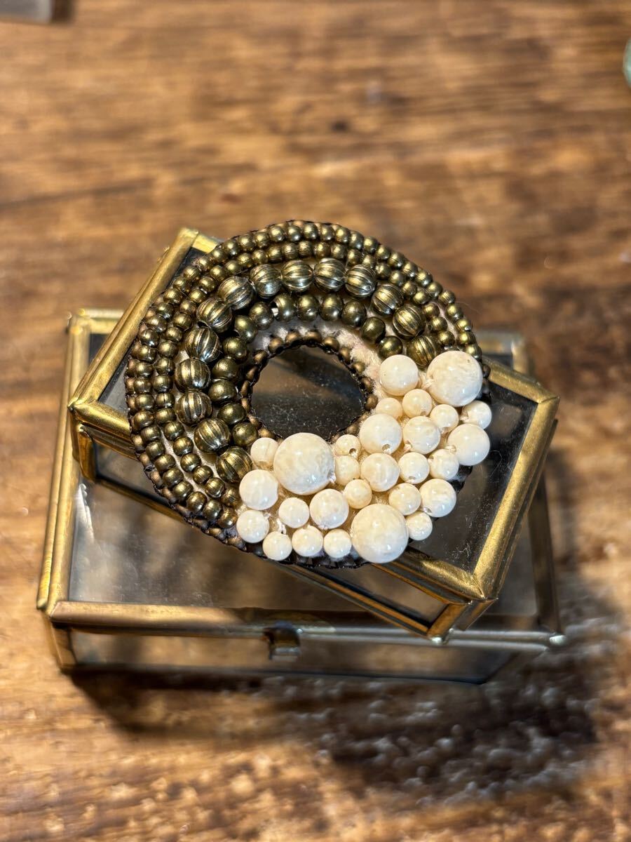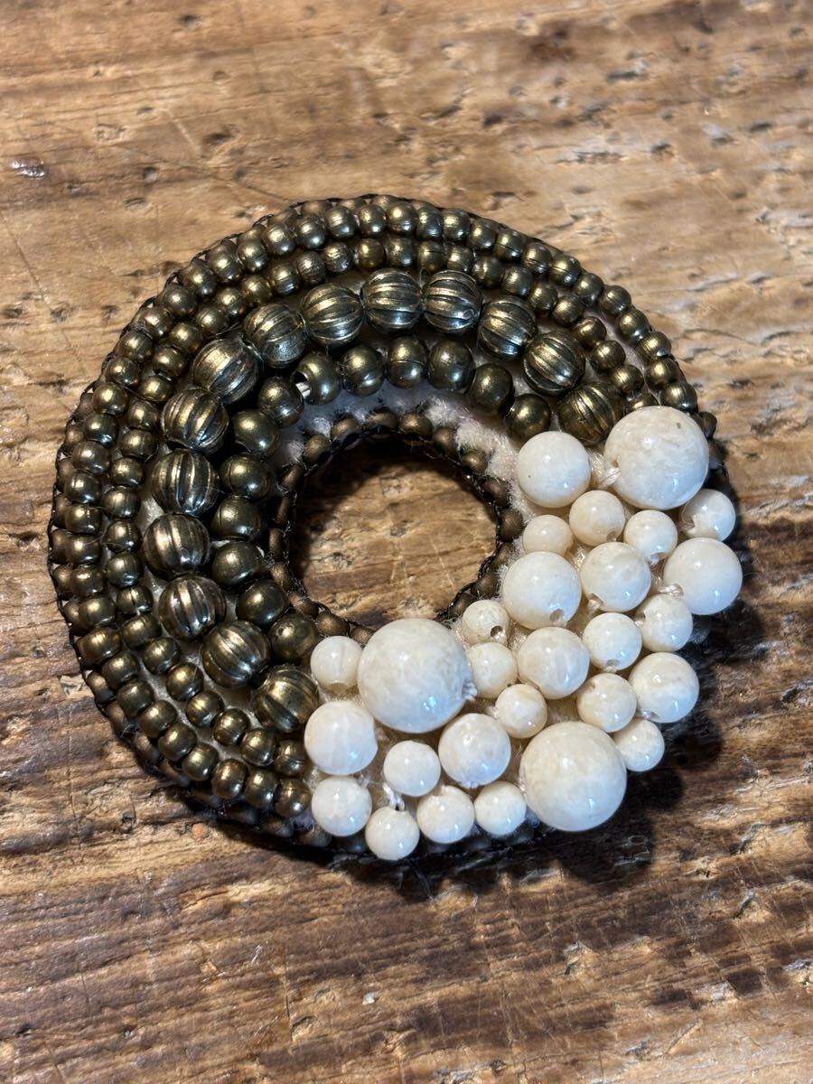 天然石リバーストーンラウンドをメタルビーズと合わせ、ビーズ刺繍でブローチにしました。