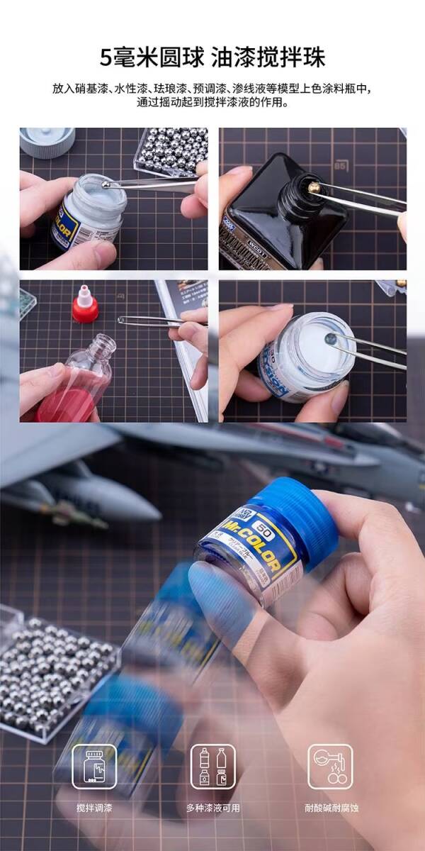 ・ステンレス製ですので、耐銹性・耐食性・耐酸性があり、ラッカー系塗料、水性塗料とも安心して使用できます。(近年人気のファレホには、ステンレスでないスチール(鉄)ボールを使用するとビン内部で鉄球がサビるという情報があります)