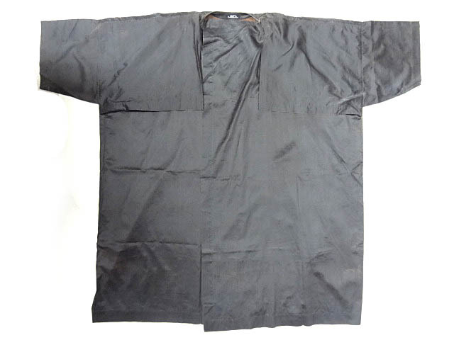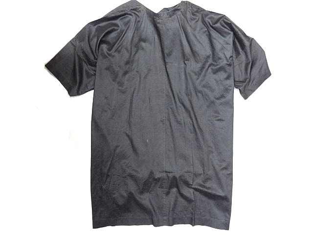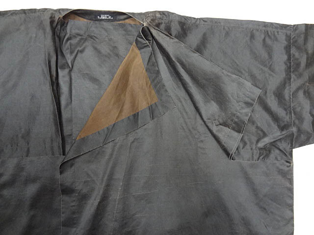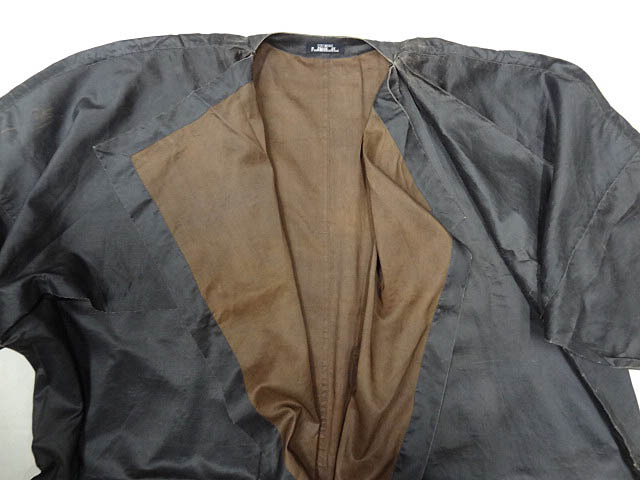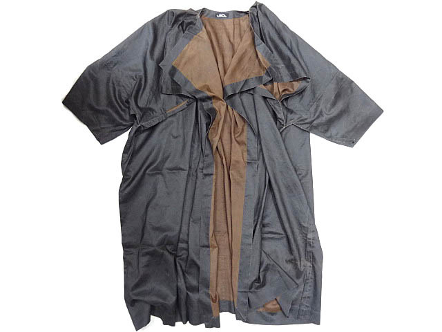 素材表記欠損。ベースはコットンポリのような質感のものにコーティング加工が施されています。表面のコーティング感はありますがハリ感はそれほどなく軽く柔らかい風合いです。デザインが文章では伝えにくいのですが,全て平面に畳むと画像1の状態になります。首付け根から脇下へ向かう斜めの余剰の生地(画像6)は特に意味はなく空洞になっている(画像8)ので,自由に遊べるデザイン状のものです。画像3と画像4のように自由に羽織ったりオーバーベルトで絞ったりすることが出来ます。袖は半端丈なので着物などがベースになっているのではないかと思います。羽織るだけでとても雰囲気のある一着です