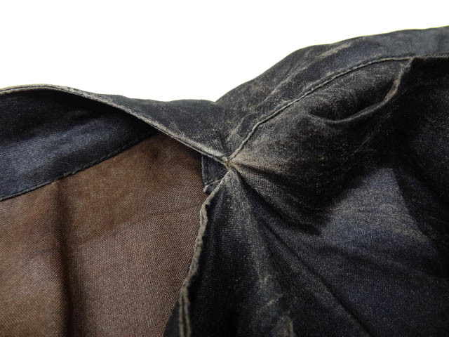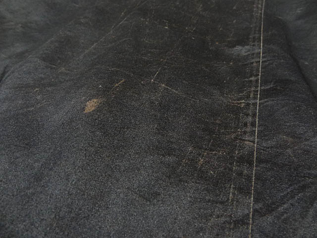 ●コンディション:表面の擦れや皺部分の褪せ感などありますが,おそらくは着ていくうちに生じる色変化をデニムのように楽しむためのコーティング加工だと想像します。実際にマットな無地よりも色味に濃淡が生じてグラデーションになっているほうがより面白い雰囲気とオーラを感じます
