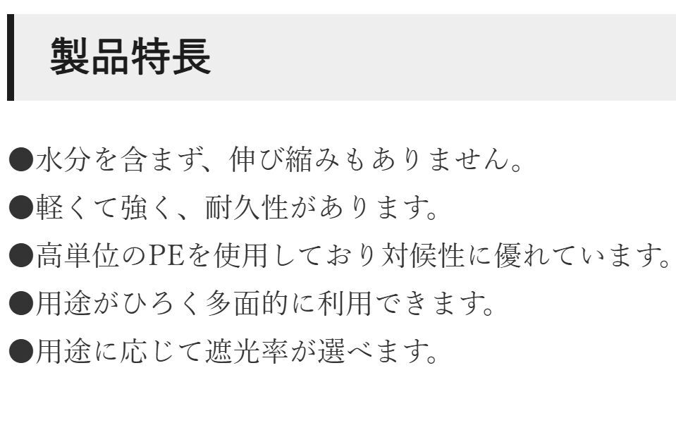 | 品 番 | 遮光率(%) | 幅(m) | 長さ(m) | 材質 |