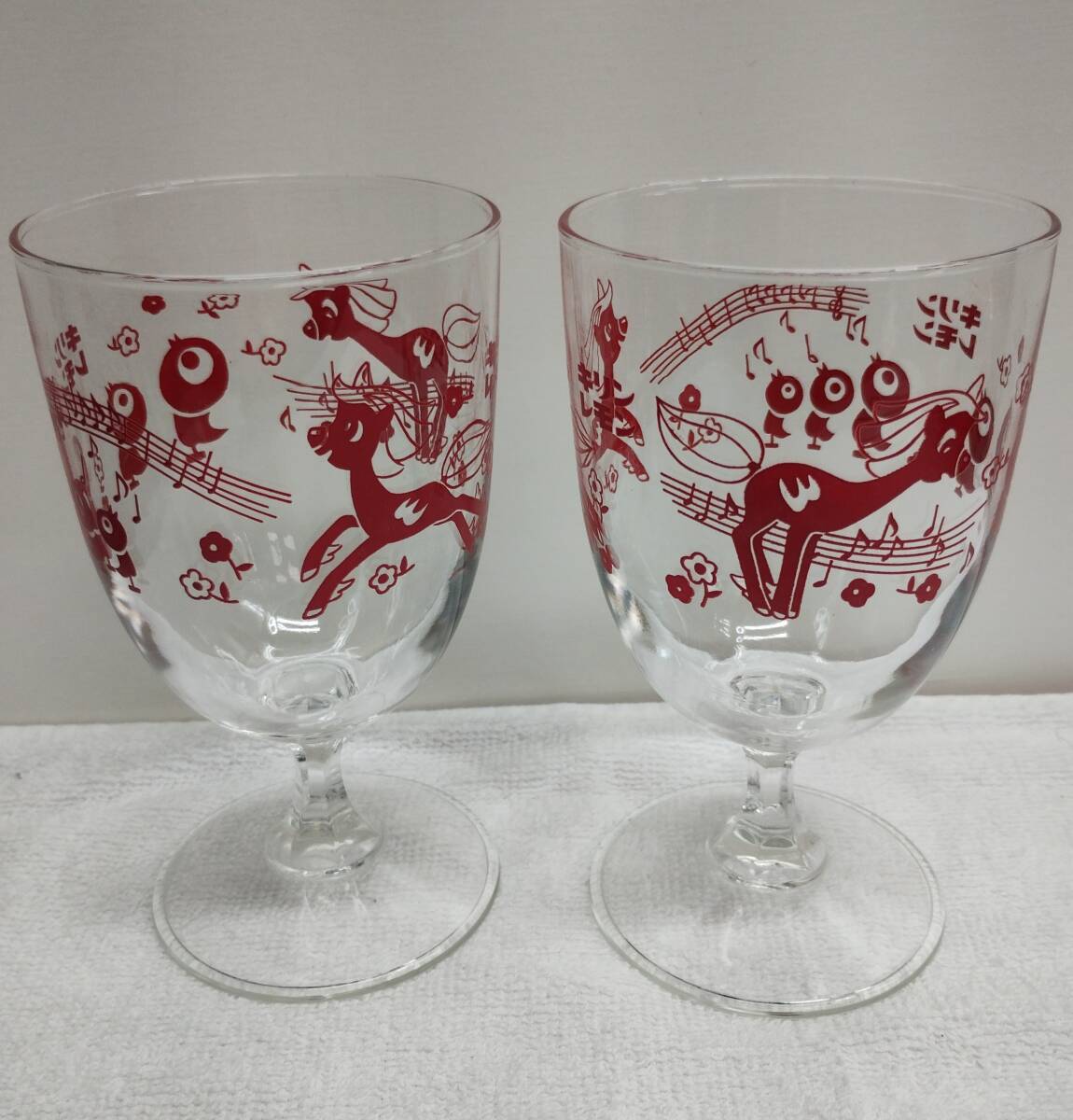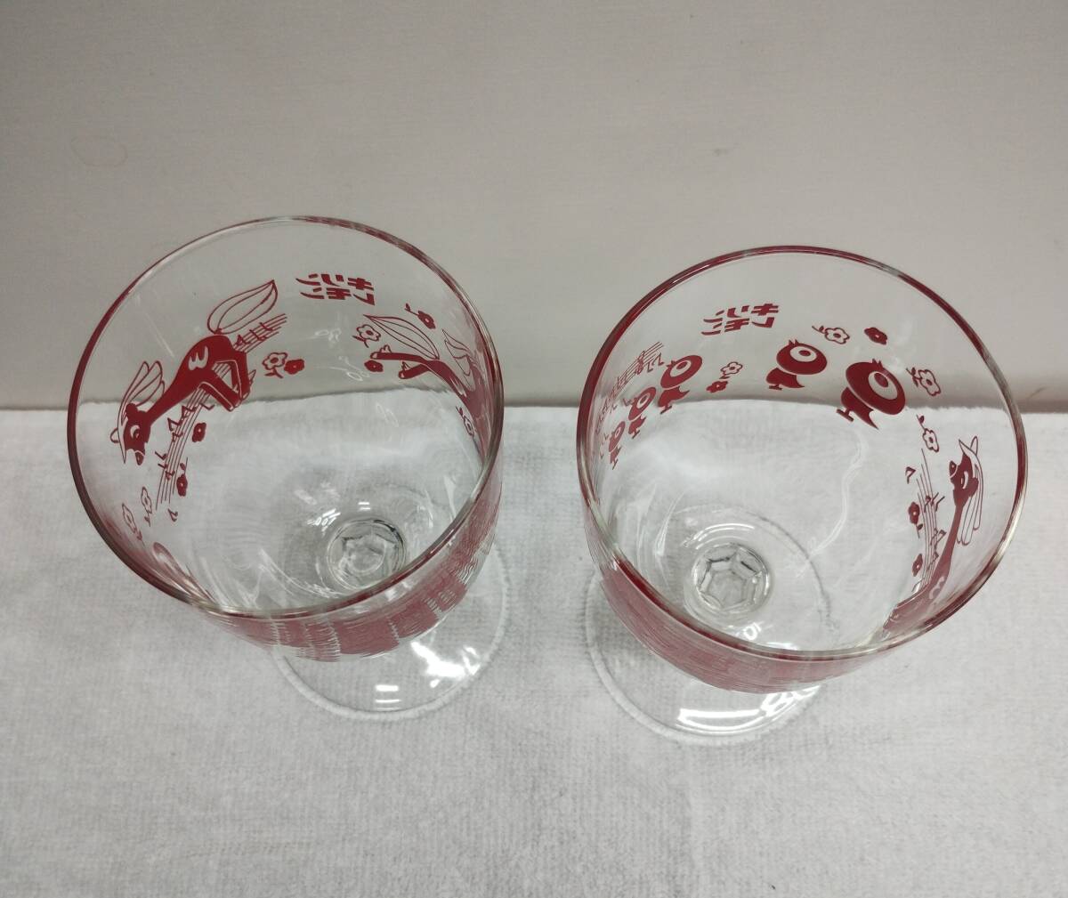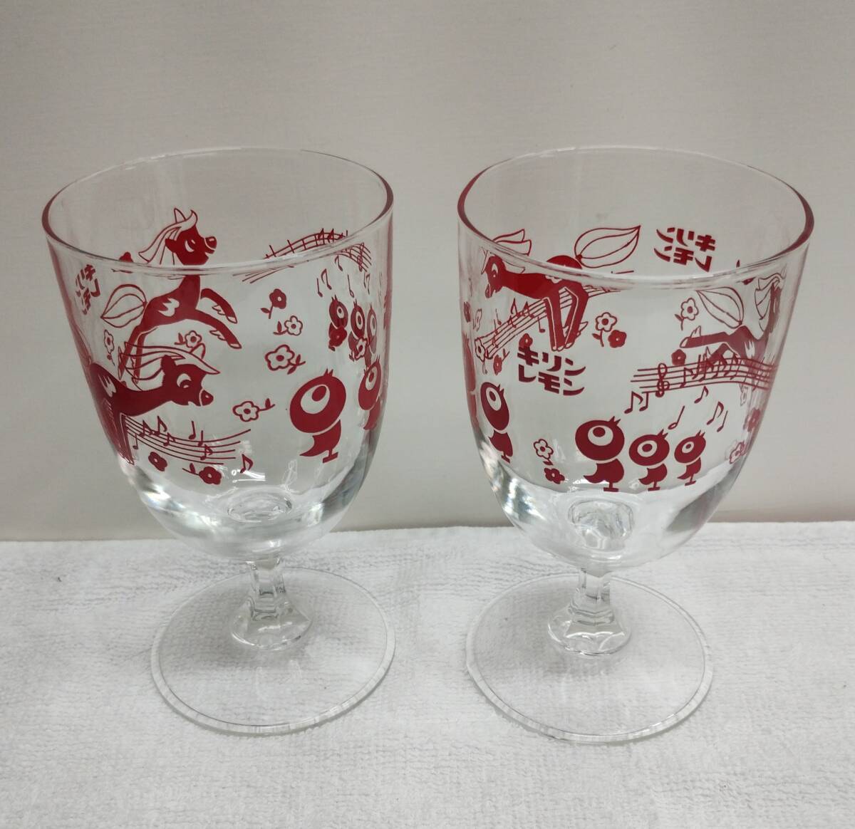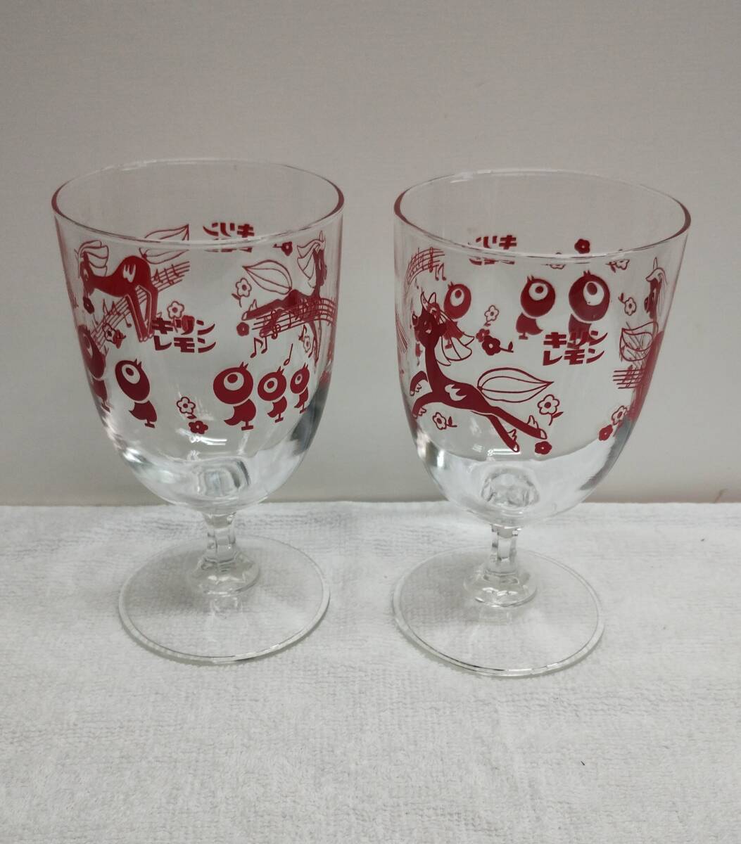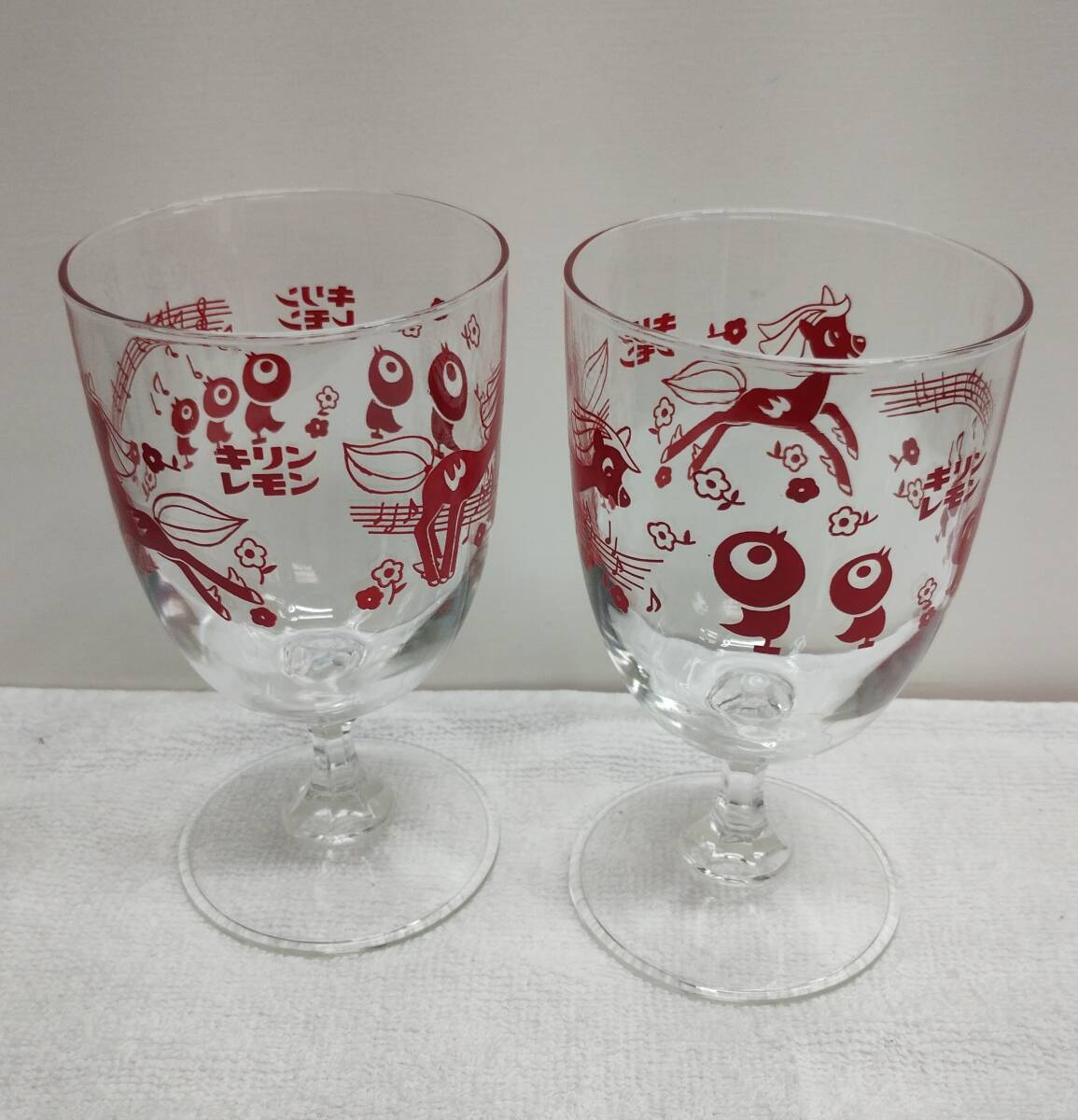 キリンレモン KIRIN LEMON ユニコーン 脚付きグラス ゴブレット 2個セット 赤 ひよこ 小鳥 昭和レトロ ポップ 現状品