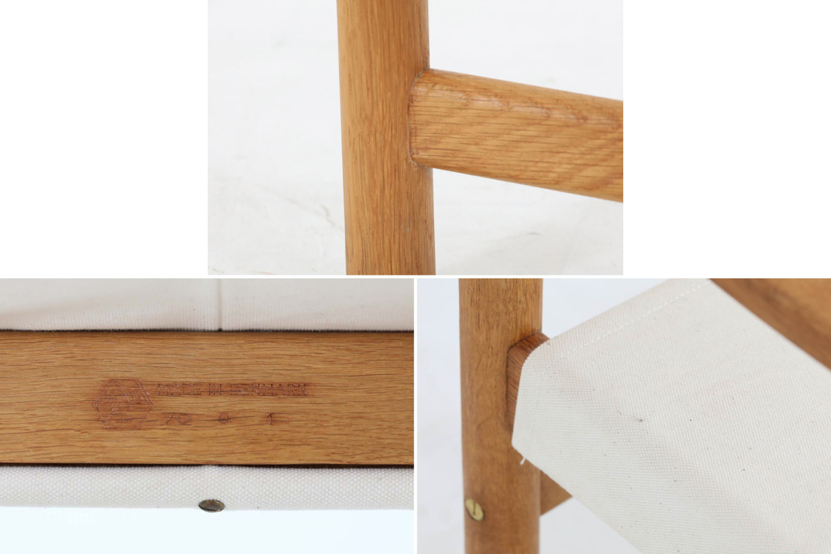 | コンディション | 経年による細かいダメージはございますが、綺麗な状態です。 ※ビンテージ品です。お伝えしきれない細かい傷や使用感等が御座います。ご了承下さいませ。 「メンテナンス内容」 木部はサンディング後、オイルを塗布しております。座面と背もたれのキャンパス地は張替え済みです。背面のベルトも本革にて作成しております。 |