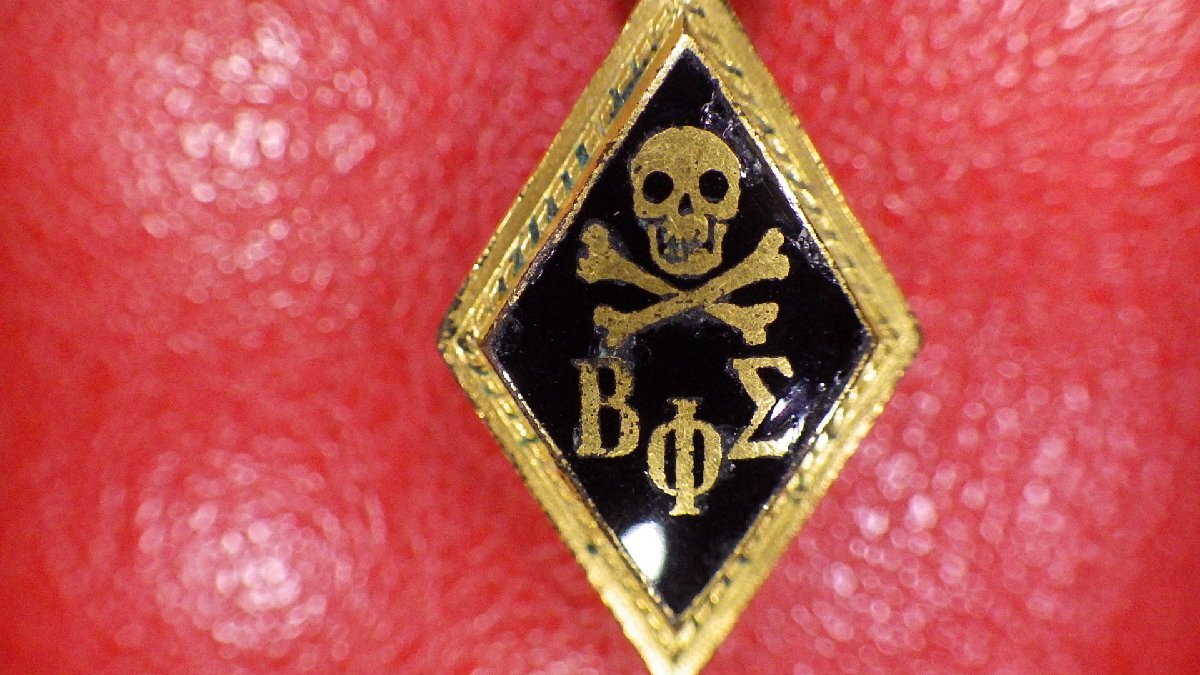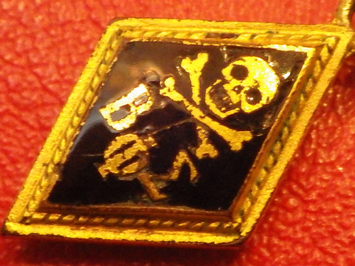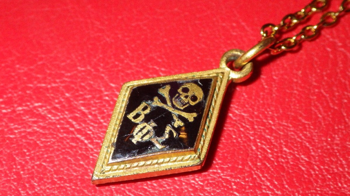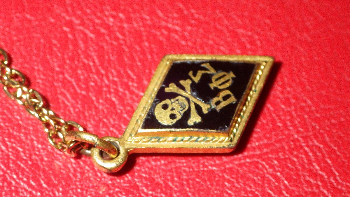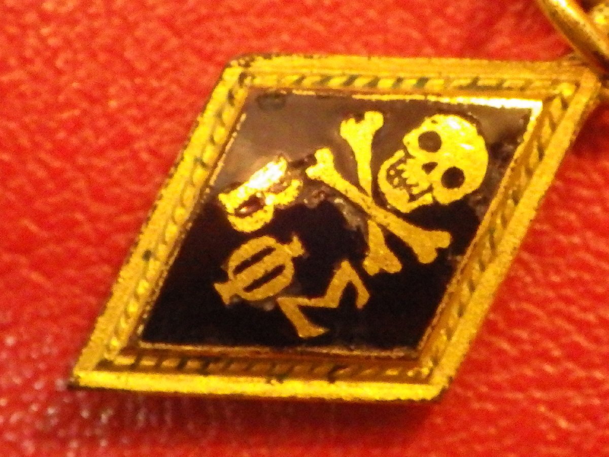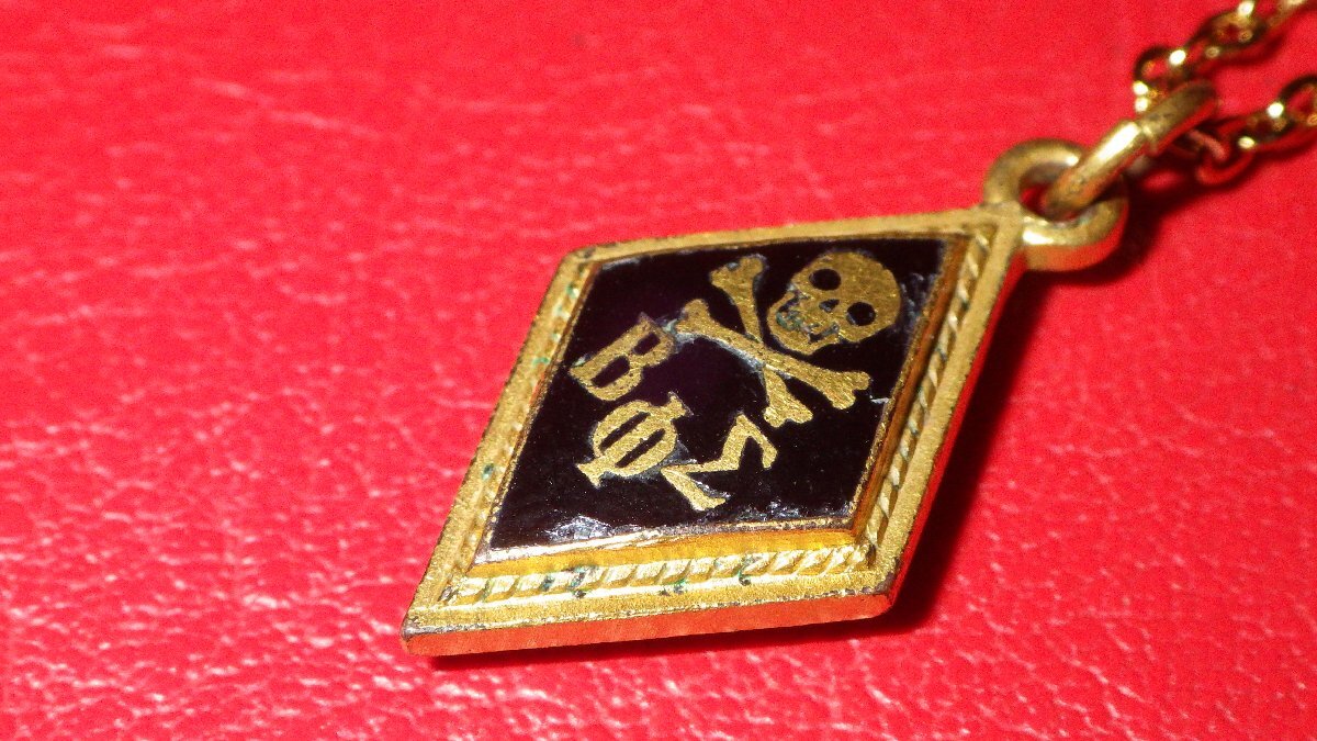 黒いダイヤ型のエナメルにスカル/クロスボーン×ΒΦΣ(Buffalo Pharmacy School)の文字が描かれたCOOLな一品です♪