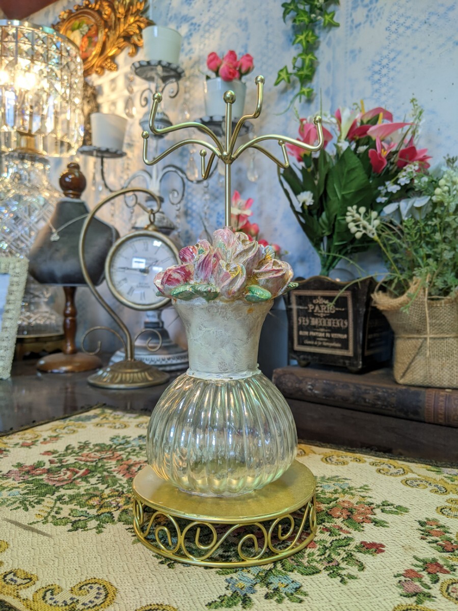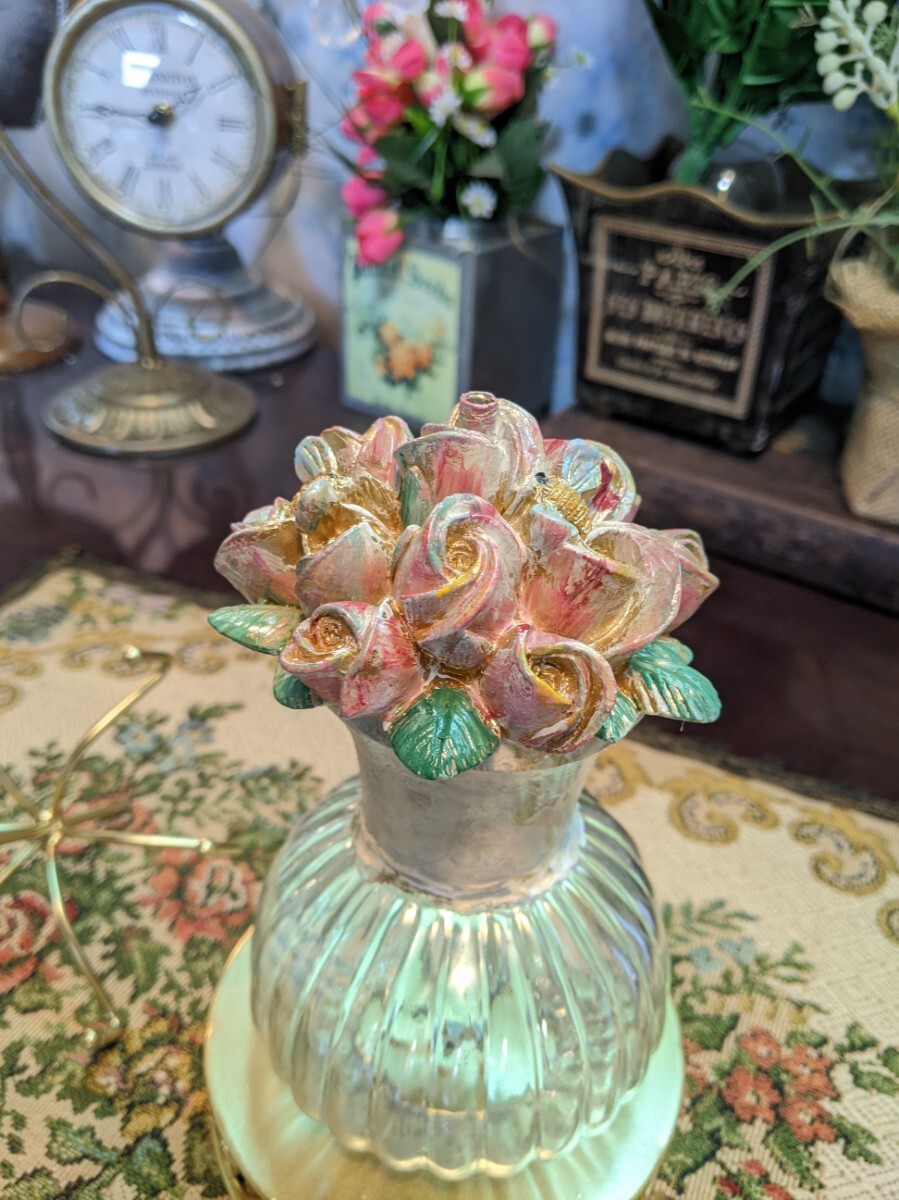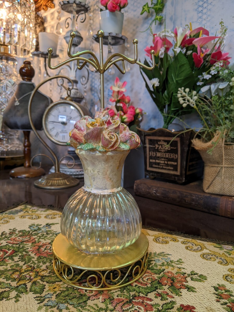 ※試作品の放出販売に伴い、市販品とは異なるデザインにし、鉢植え薔薇はアンティークペイントにて色味を着けし、高さを持たせてデザインした物となります。