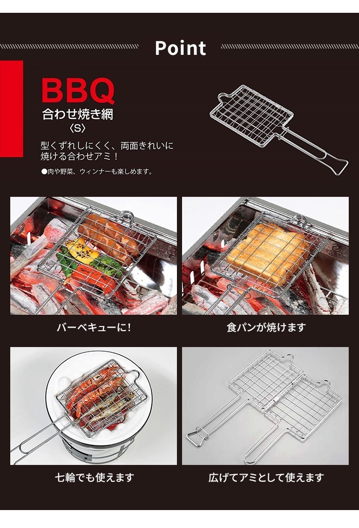 | 型くずれしにくく両面きれいに焼ける、合わせ焼き網です。 食パン、お肉や野菜、ウインナーも楽しめます。 七輪でも使えます。 広げればアミとしてお使いいただけます。 |