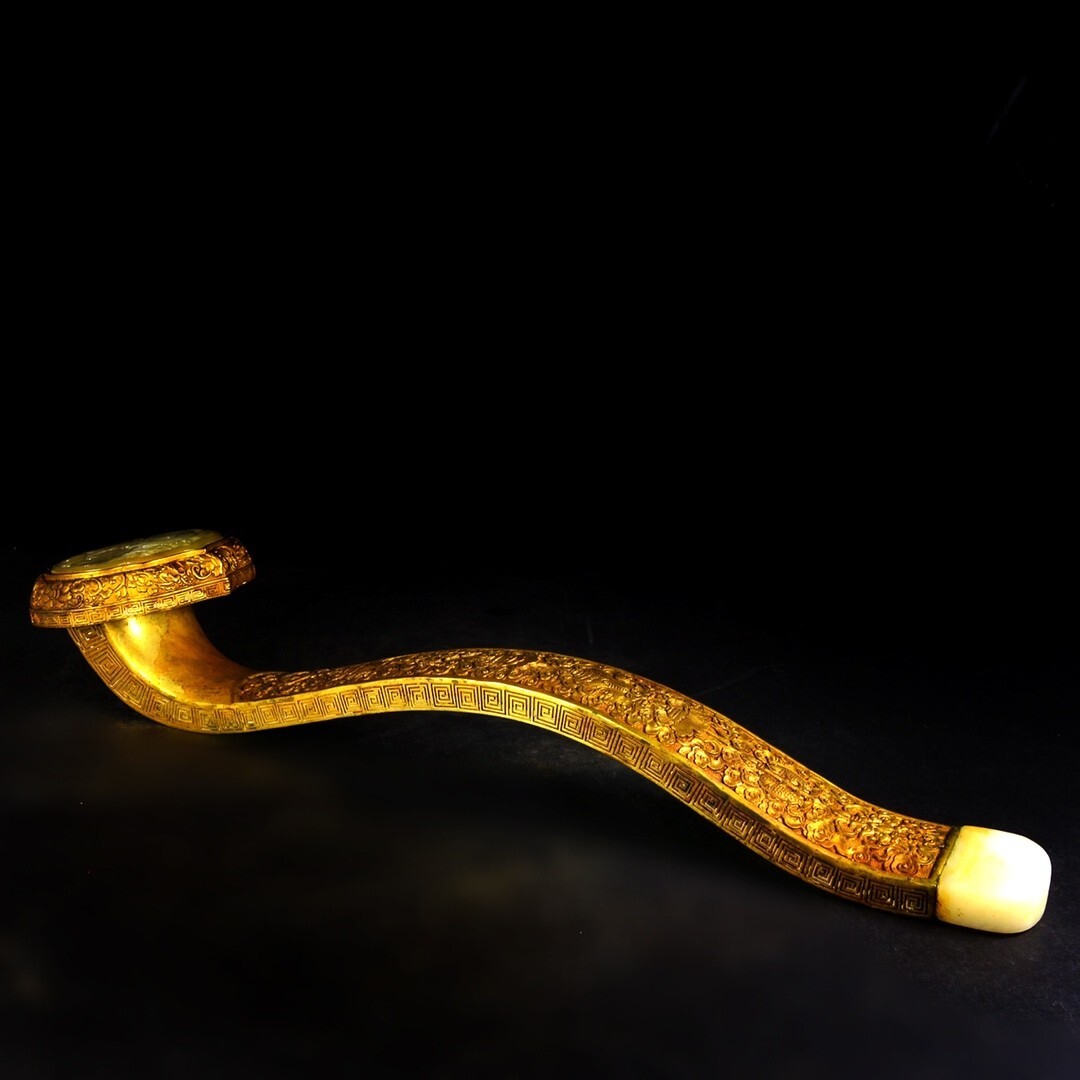永し 清時代 古銅塗金 和田玉嵌 八寶如意件 極細工 置物擺件 古美術品 時代物 古董品 収集 旧家蔵出 中国唐物 A291