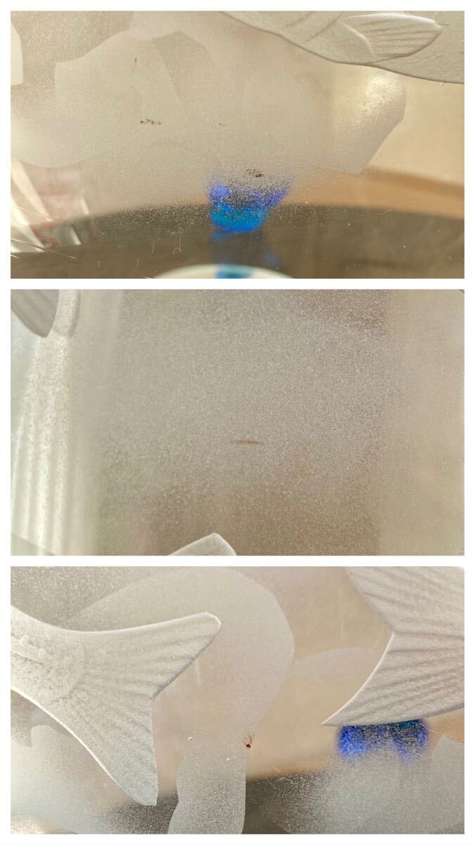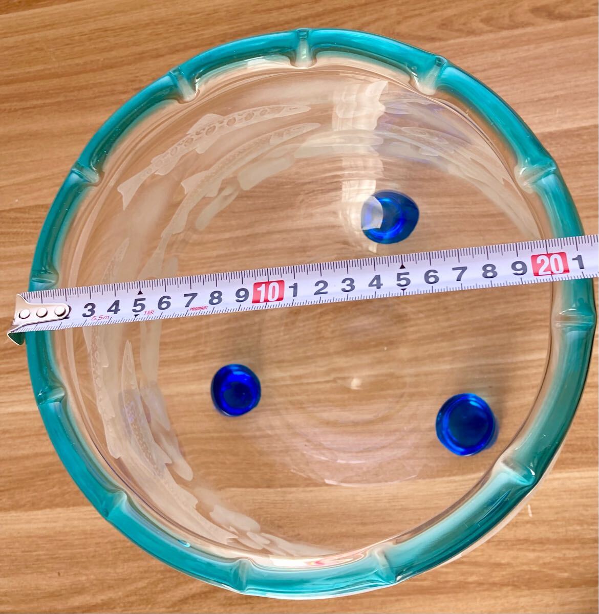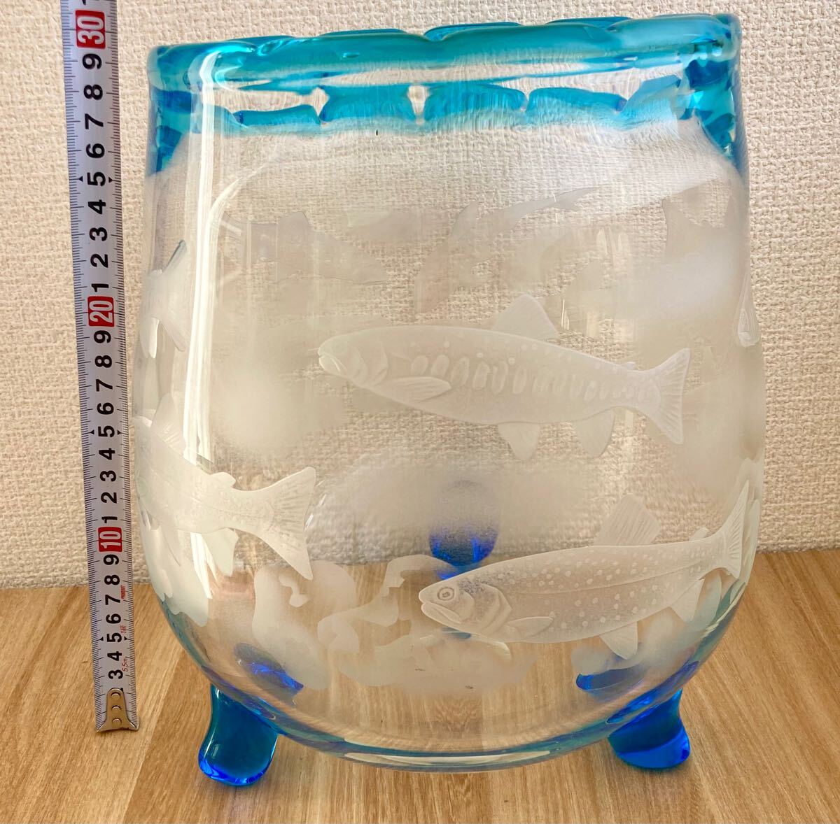 青木幸生作 ガラス大き目な金魚鉢 美しい清流魚柄 サンドブラスト 約5kg 高さ30cm 希少品 ※脚2か所欠けあり