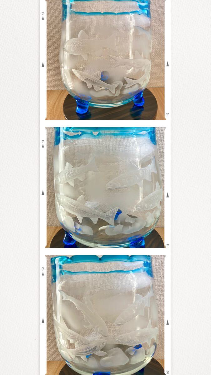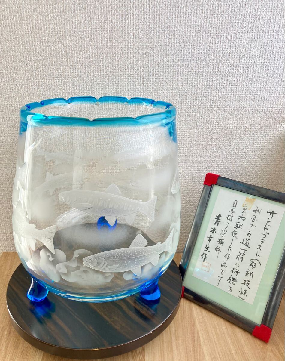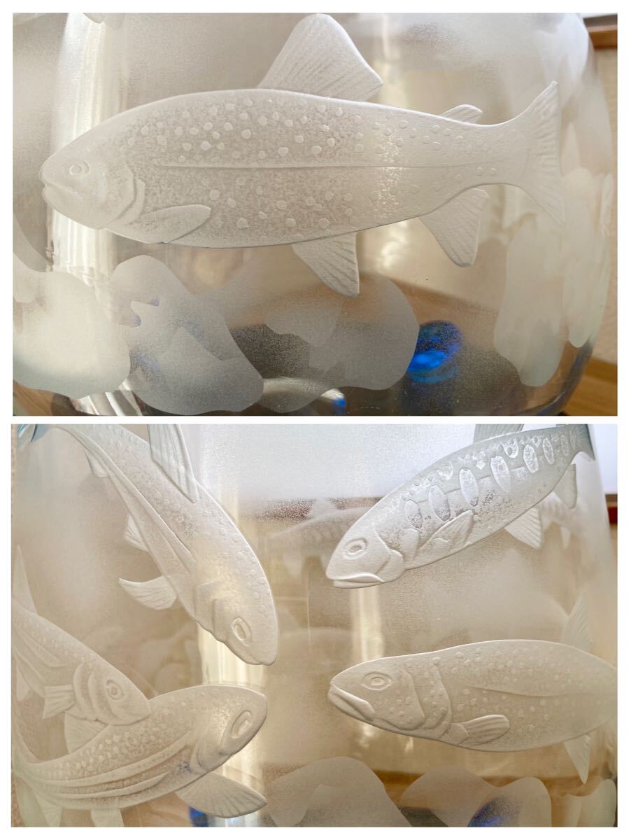 サンドブラストで清流魚が非常に丁寧に美しく描かれてます