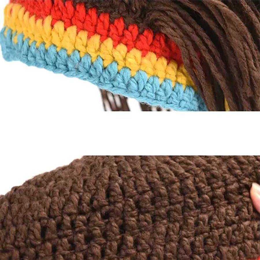 一本一本手編みで作られているので解けにくく丈夫です。上部にドレッドヘアが付いたニット帽はふさふさの毛糸で頭を寒さから守ります。防寒対策としても一風変わったおしゃれを楽しめます