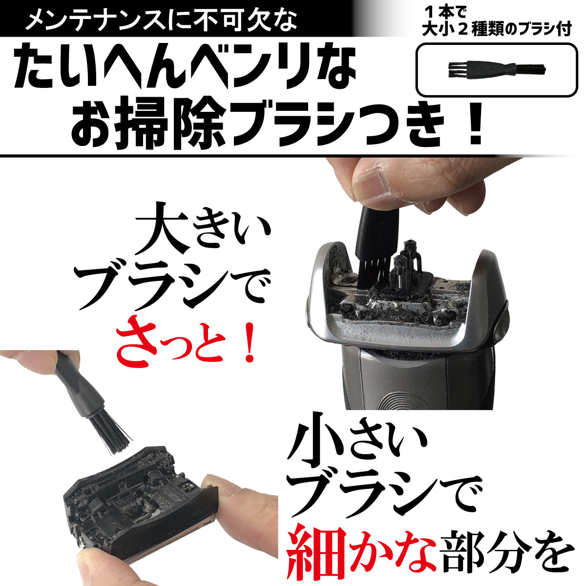 互換品になりますが、純正品よりお安いので経済的で、シェーバー内を掃除するブラシが付属します。