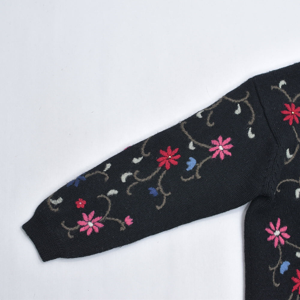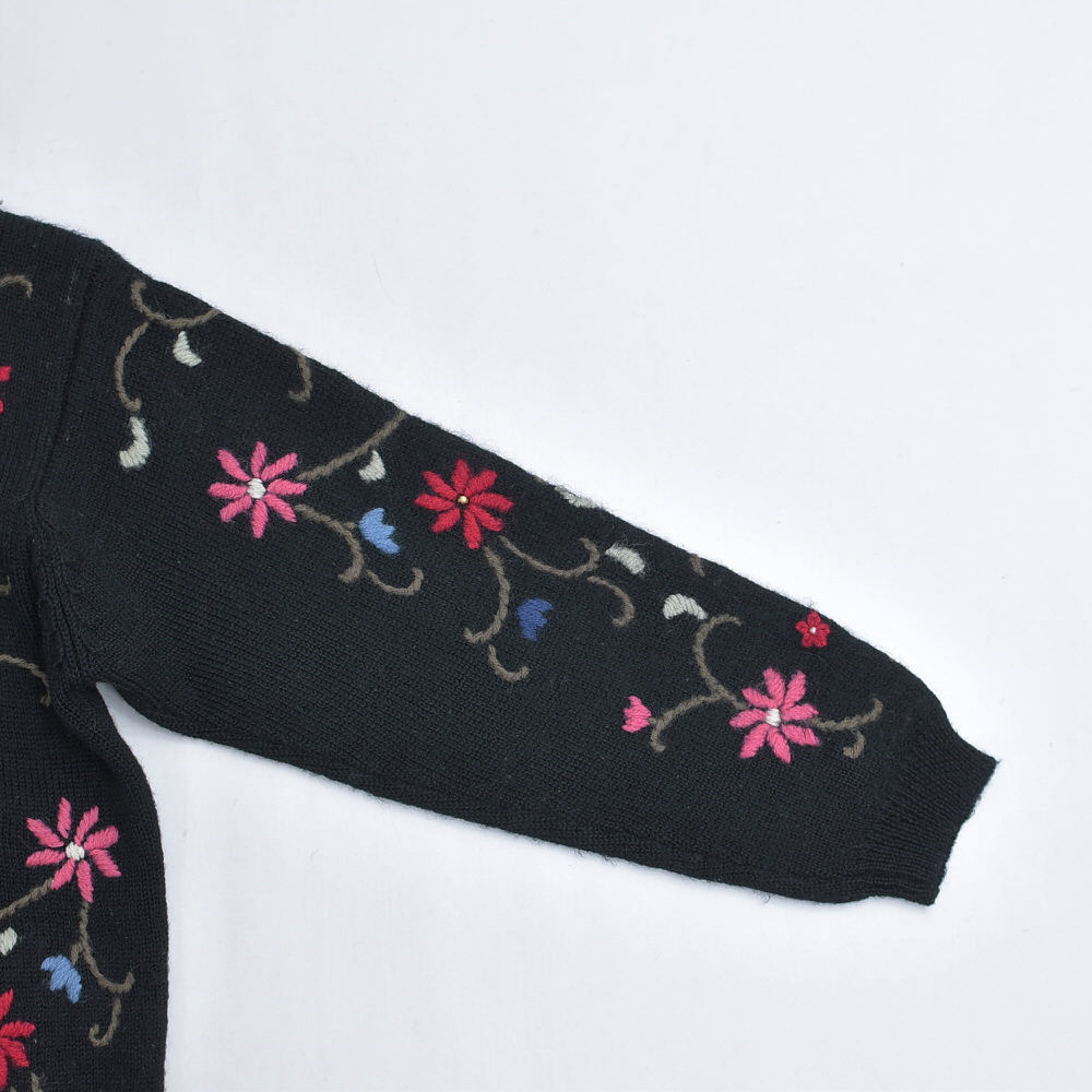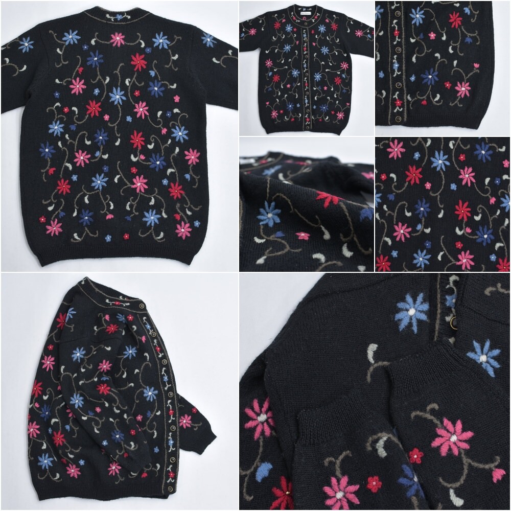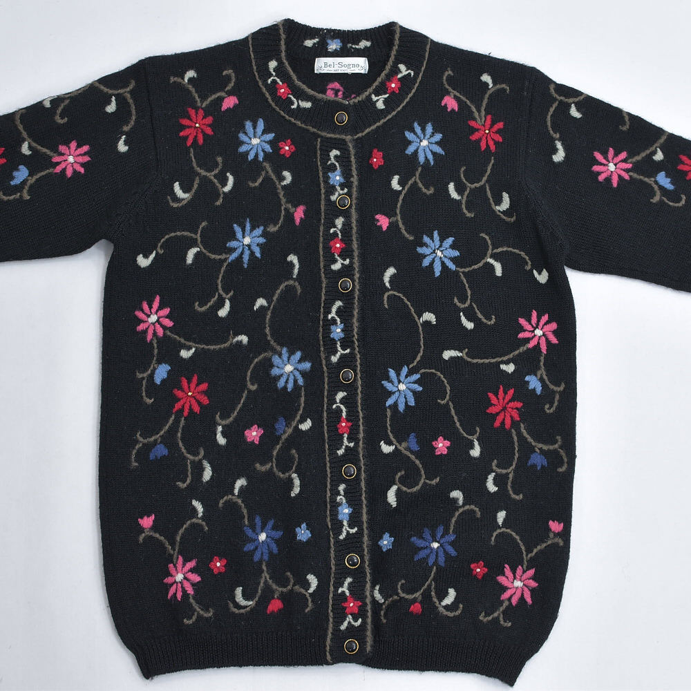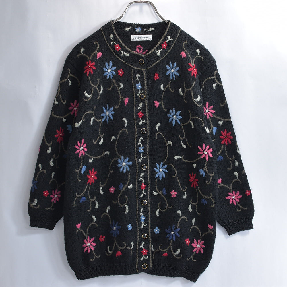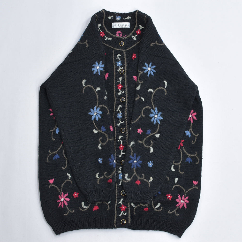 80~90s Bel-Sogno お花 総刺繍デザイン ウールニットカーディガン レトロ フラワー刺繍 ジャパンヴィンテージ セーター ビンテージ ブラック 古着 レディースM相当