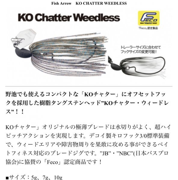 KOチャター」オリジナルの極薄ブレードは水切りがよく、超ハイピッチアクションを実現します。デコイ製キロフック3/0標準装備で、ウィードエリアや障害物周りを果敢に攻める事ができるベイトフィネス対応のブレードジグです。「JB」・「NBC」(日本バスプロ協会)に協賛の「Feco」認定商品です!