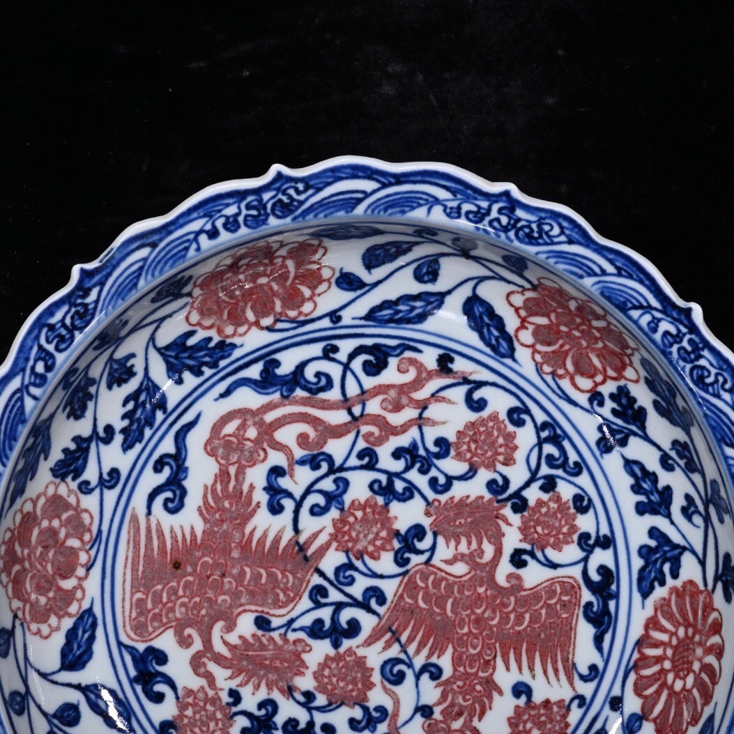 【超珍館蔵】明 宣德年製款 古陶瓷品 青花 釉里紅 雙鳳紋 供盤 置物 古賞物 古美術品 稀少珍蔵品