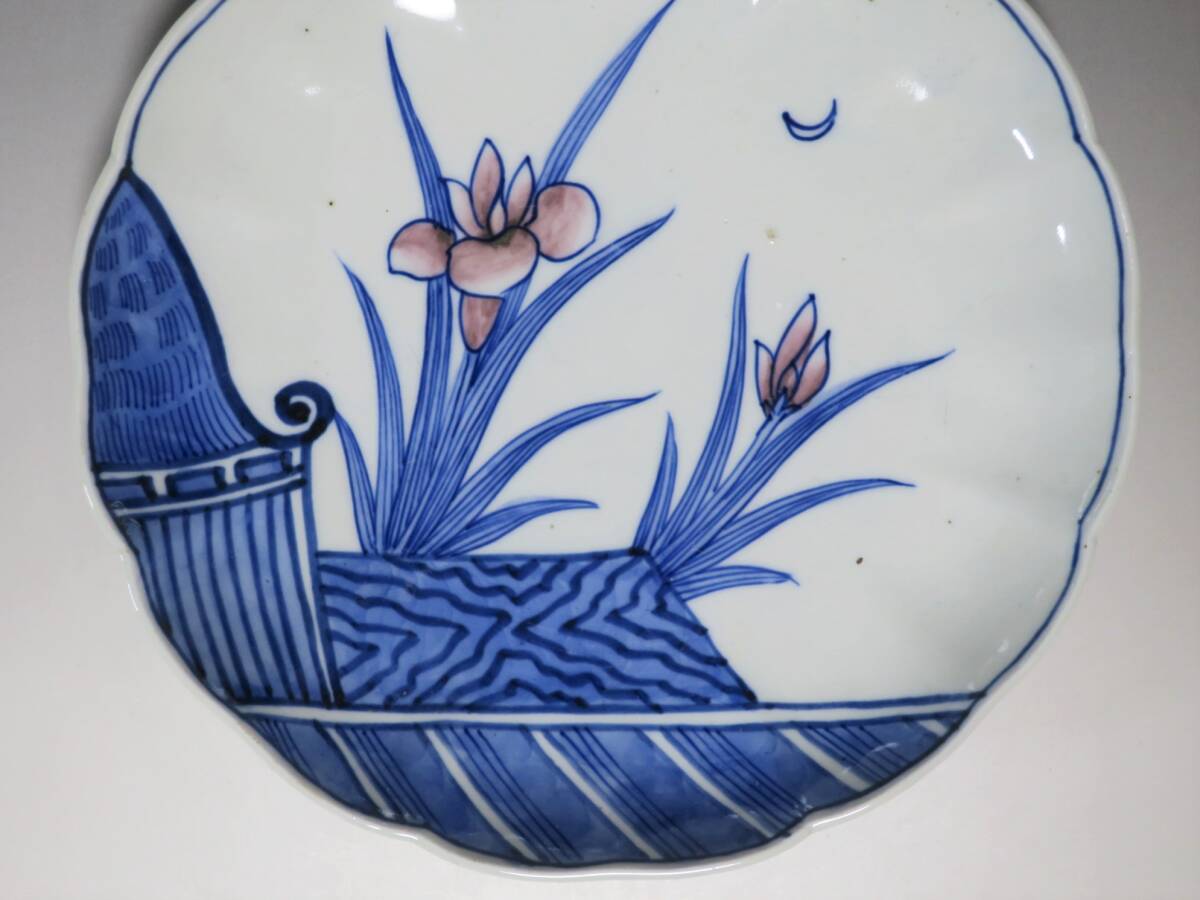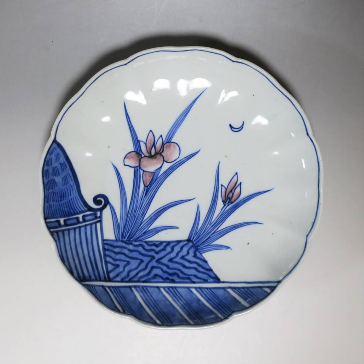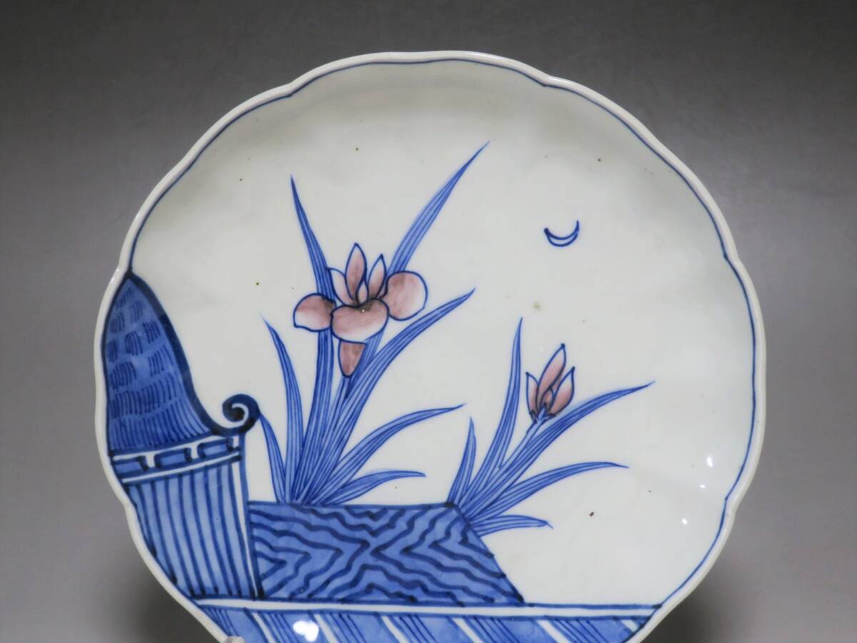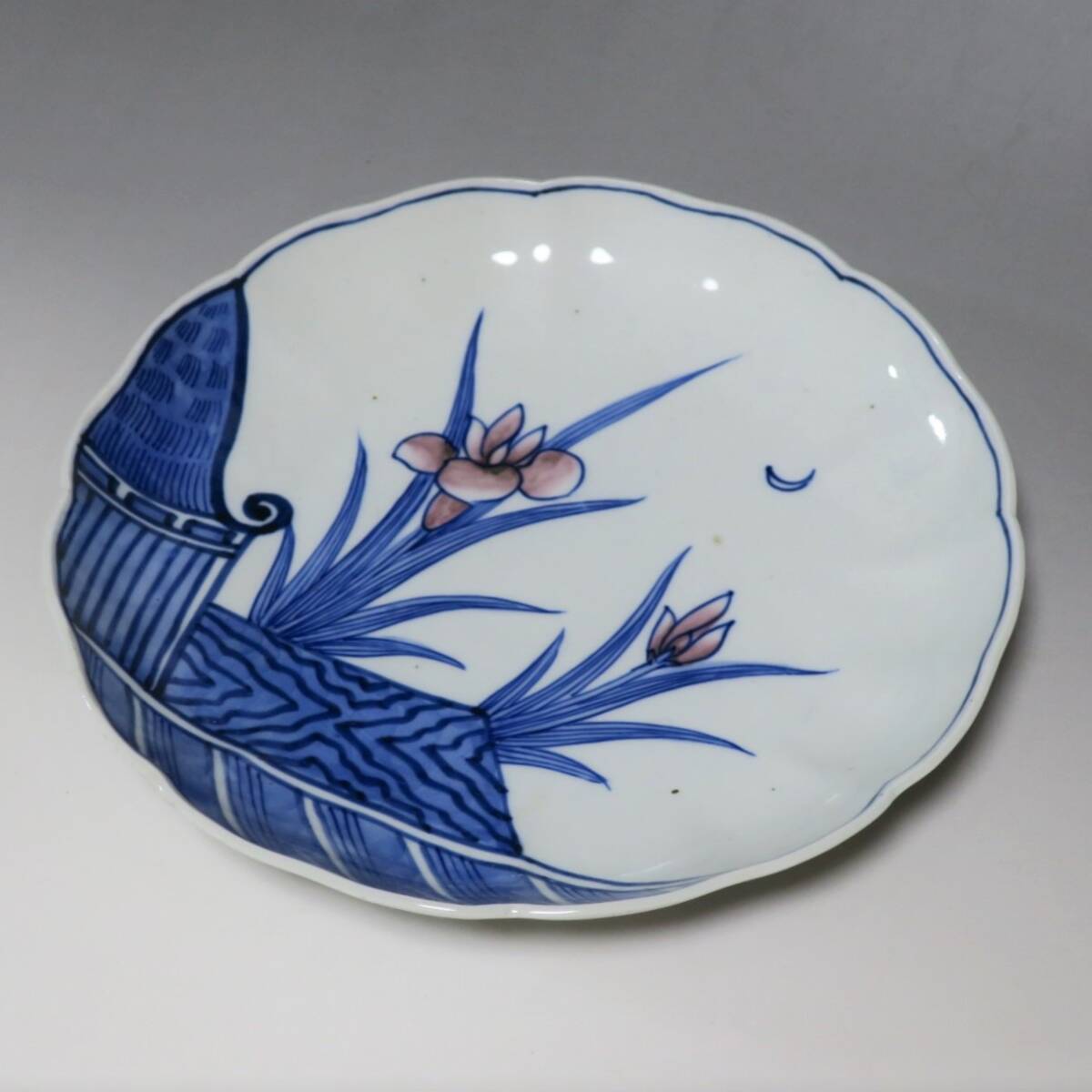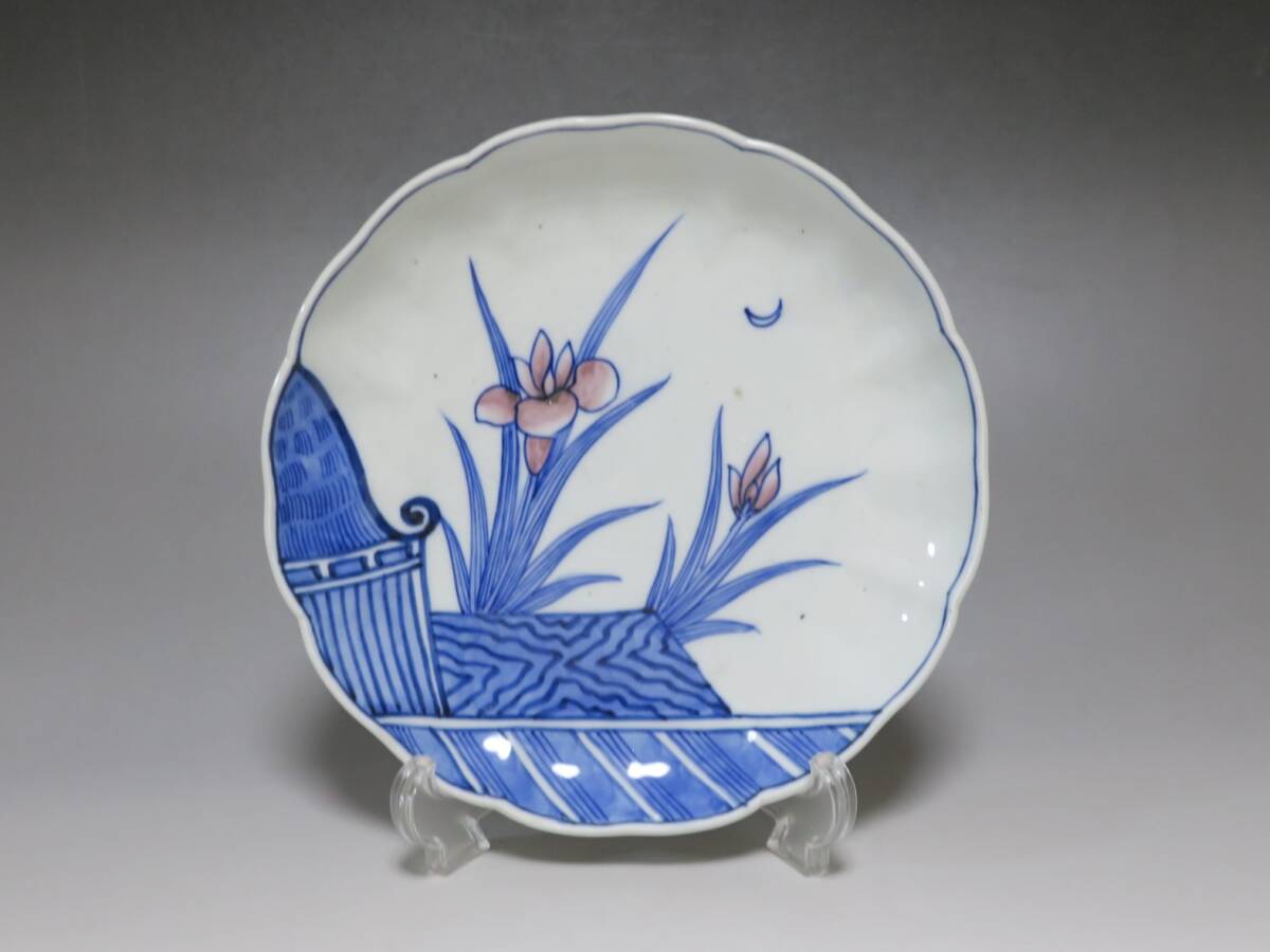 伊万里焼 染付色絵 月に菖蒲 庭園 邸宅図 七寸皿【B】 和食器 明治時代