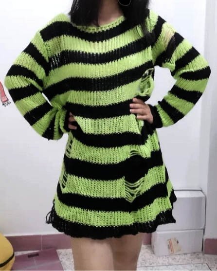 新品 ボーダーニット ダメージ クラッシュ 黄緑 1693 メンズ レディース 地雷系 セーター パンク ロック ゴシック グランジ ヴィジュアル系
