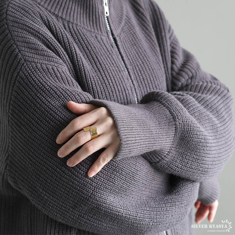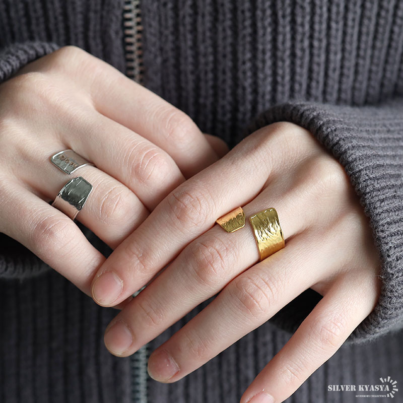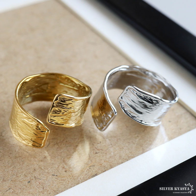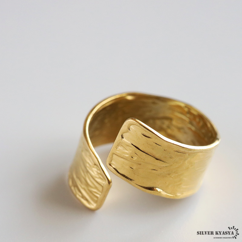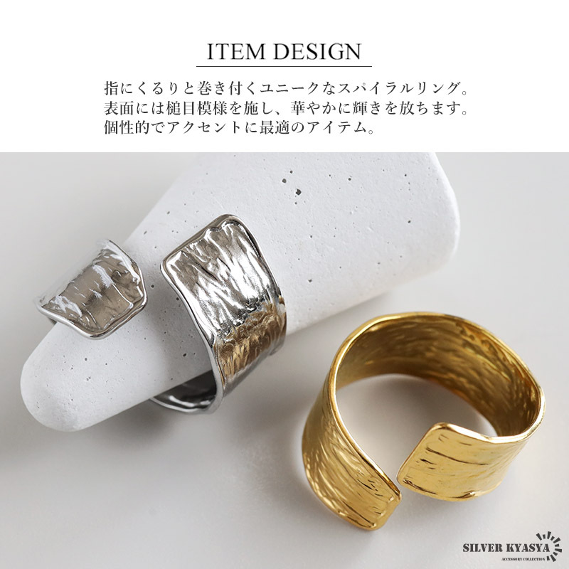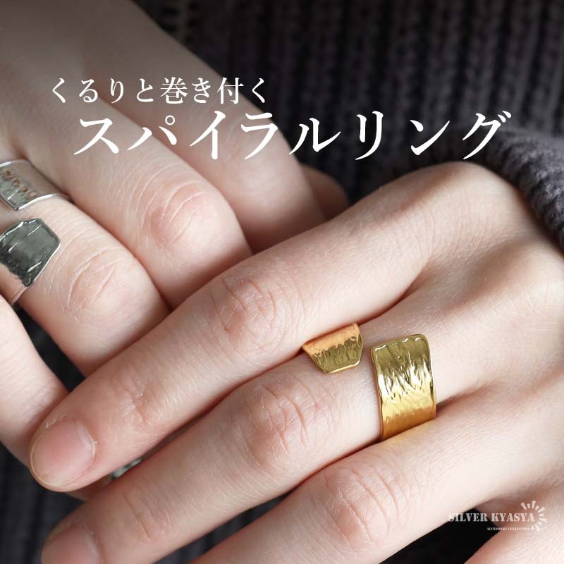 指にくるりと巻き付くユニークなスパイラルリング。表面には槌目模様を施し、華やかに輝きを放ちます。個性的でアクセントに最適のアイテム。
