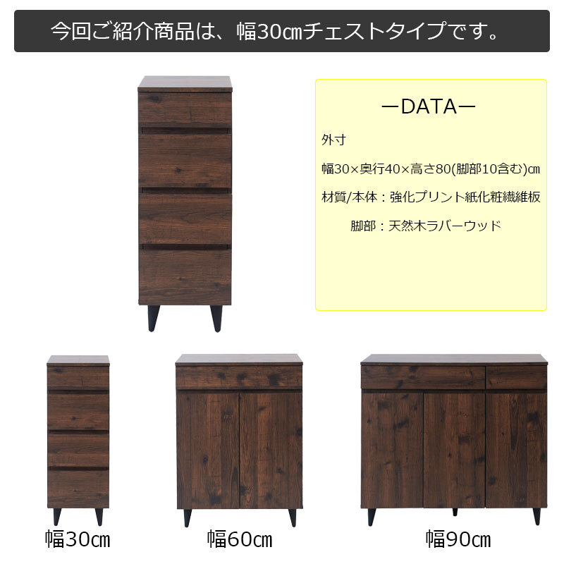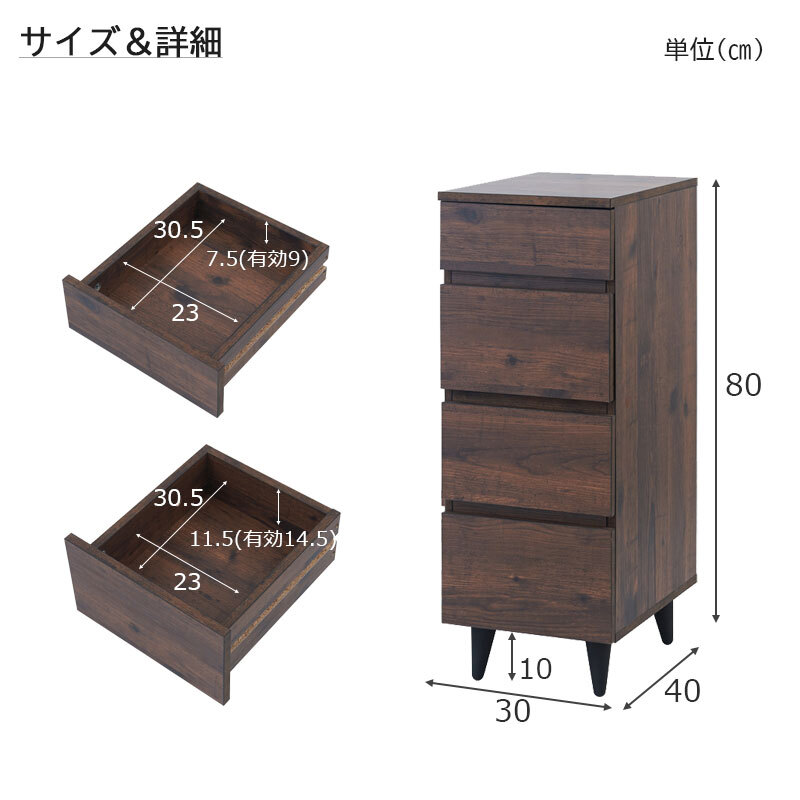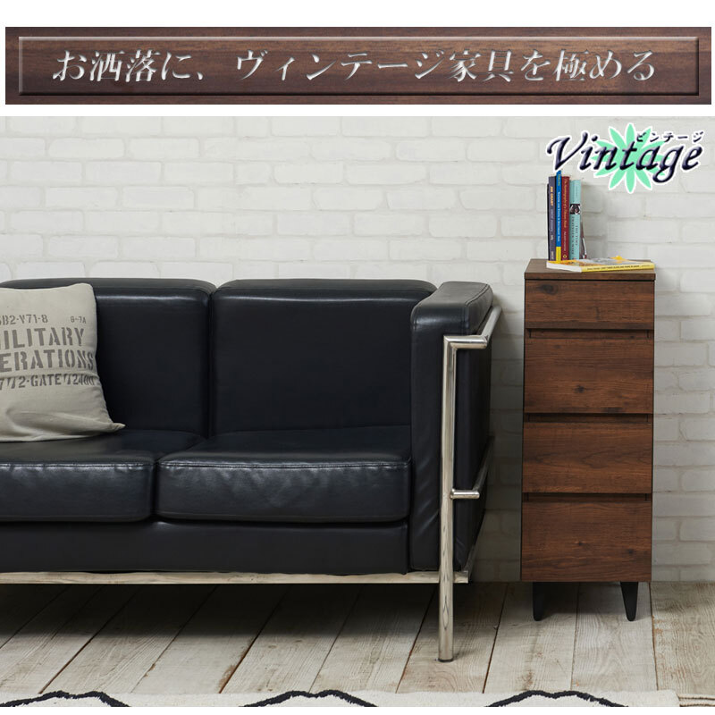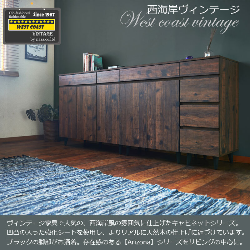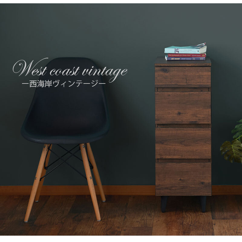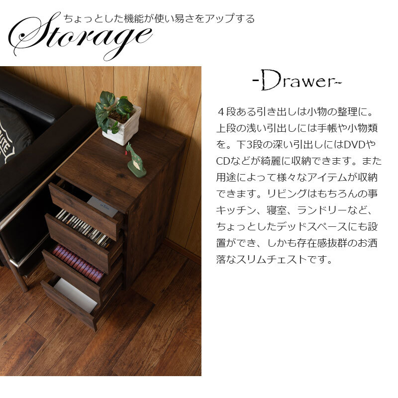 ■商品について/西海岸インテリアに『ARIZONA』シリーズが新登場!ヴィンテージ感漂う深みのあるブラウンをベースに美脚効果で軽やかでスタイリッシュなデザインに仕上げたチェスト。スリムな約30cm幅はデッドスペースや玄関などにちょいっと置けるおしゃれなチェストで、4段ある引き出しで小物の整理に最適です。上段の浅い引出しには手帳や小物類、下3段の深い引出しにはDVDやCDなどが綺麗に収納できます。また用途によって様々なアイテムが収納できます。リビングはもちろんの事キッチン、寝室、ランドリーなど、ちょっとしたデッドスペースにも設置ができ、しかも存在感抜群のお洒落なスリムチェストです。さわやかで心地いいお部屋は理想的で憧れるインテリアで、気取らずそれでいて、かっこよさを忘れないスタイルも西海岸風インテリアの特徴。重厚感あるカラーリングに薄型で絶妙なサイズバランスはARIZONAの真骨頂。