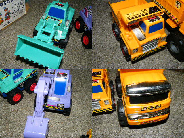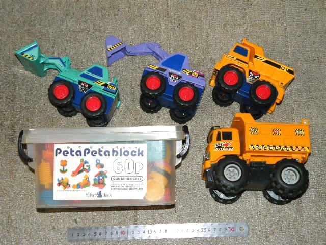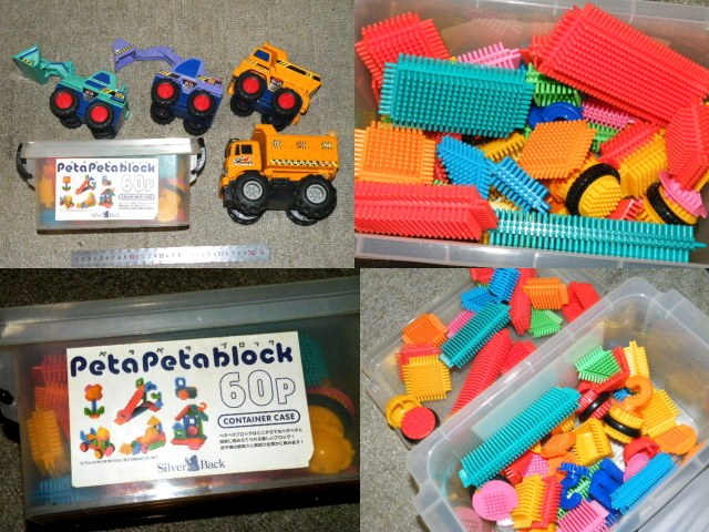 o品名o ★処分スタート出品★petapetablock ペタペタブロック コンテナ入り+少し大きめの働く車カー自動種など各種お付け=まとめ売りセット♪組立ブロック玩具トイお子様キッズ系 |