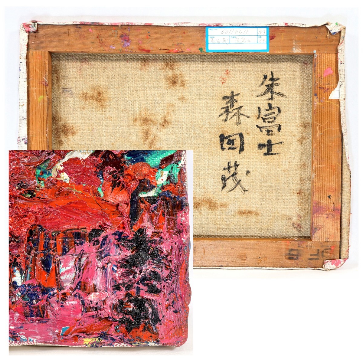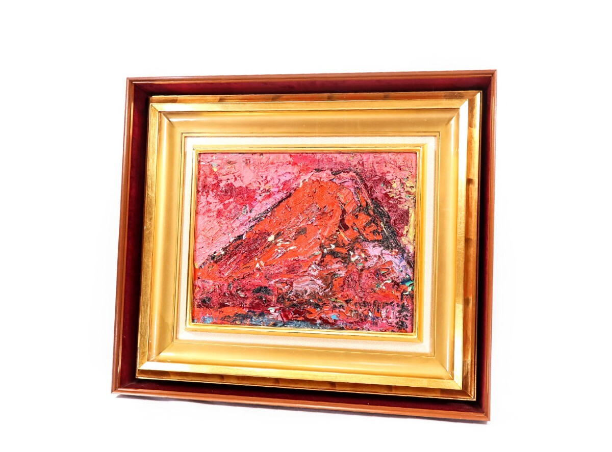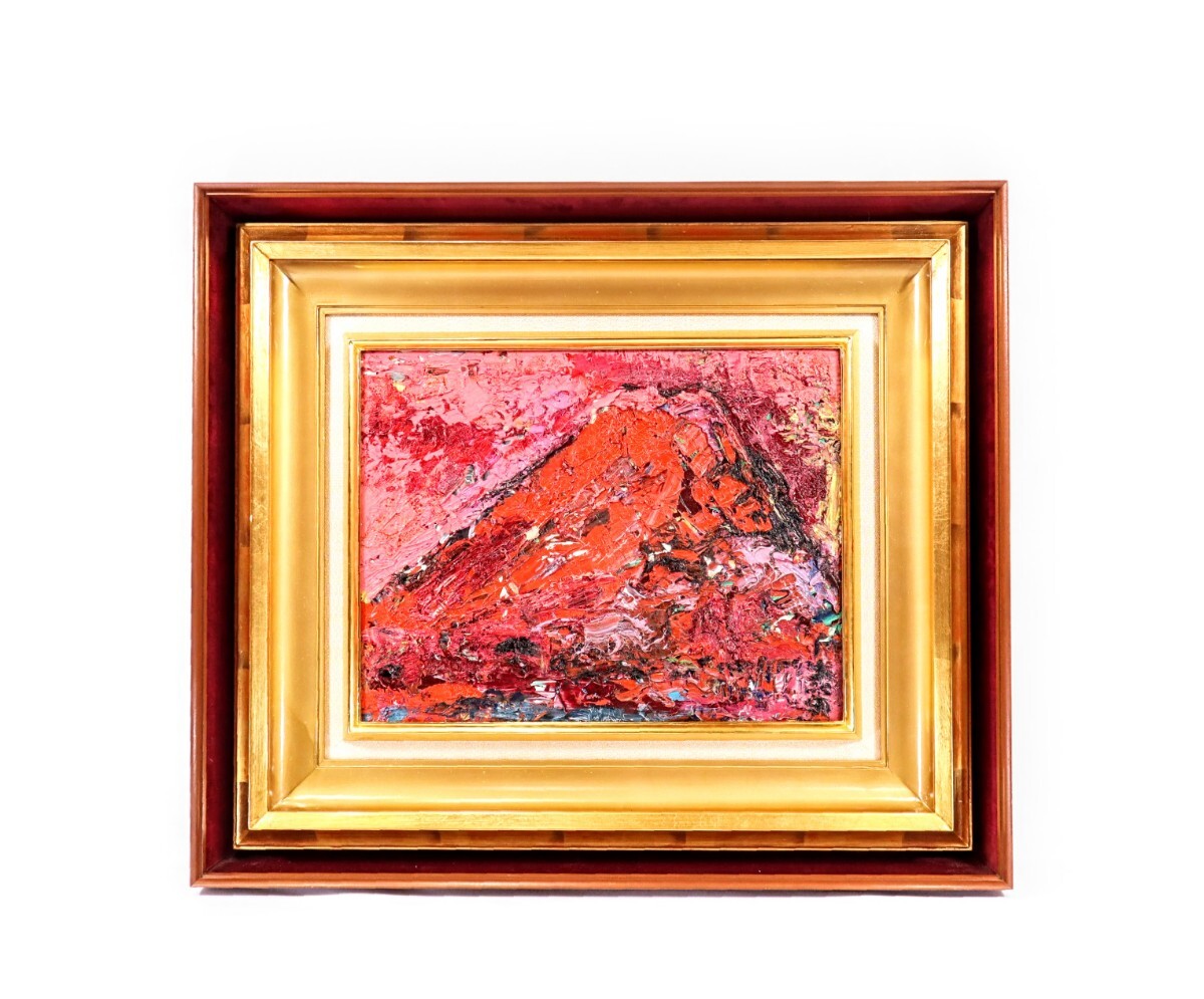 真作 森田茂 油彩「朱富士」画寸 F6 茨城県出身 日本芸術院会員 原色を多用、力強く重厚な筆致 生命力溢れる富嶽の雄姿 立派な額装 10521