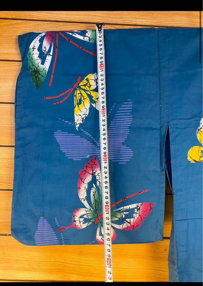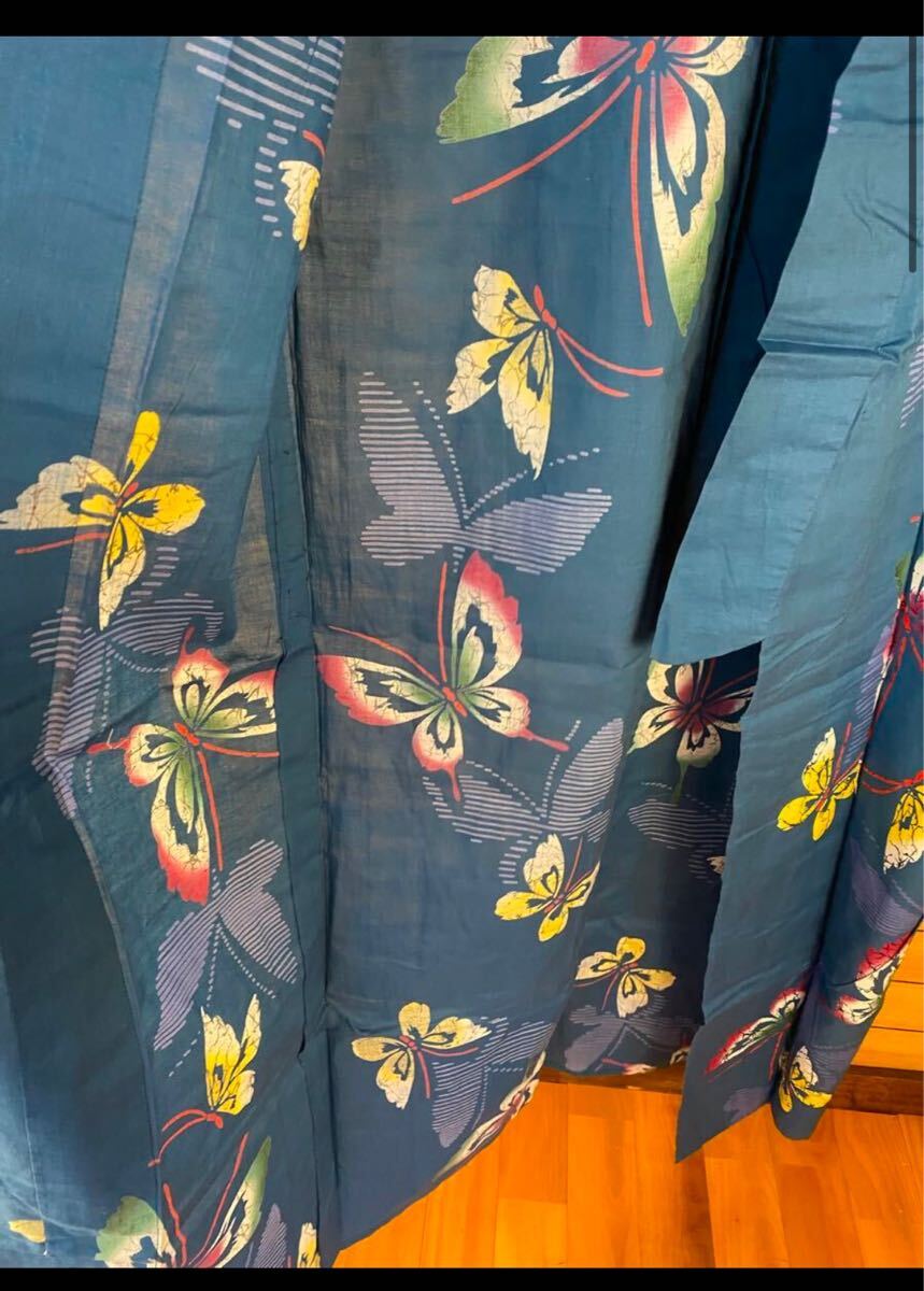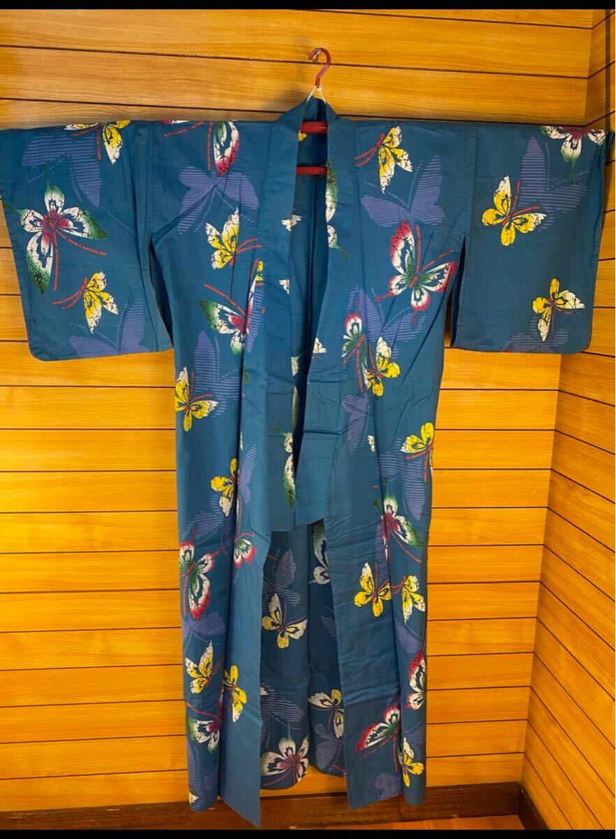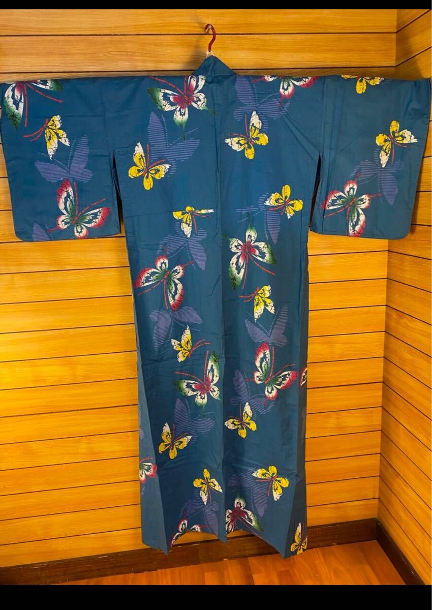 美品! 浴衣 身丈152 綿 蝶 藍色