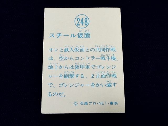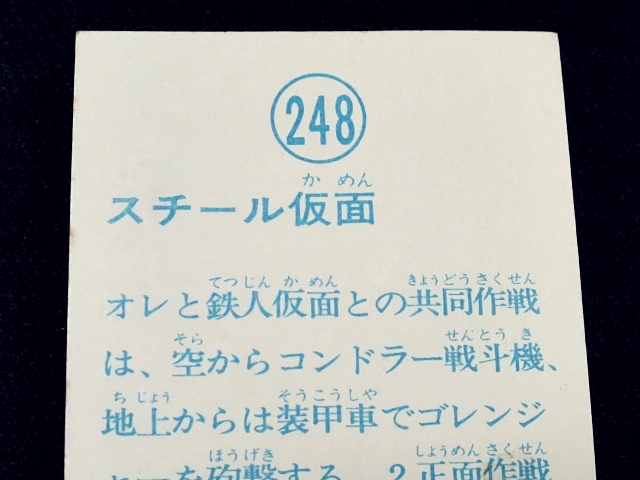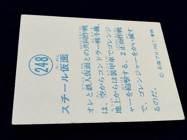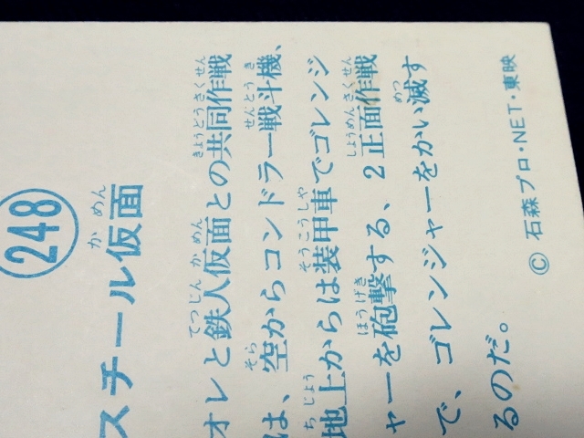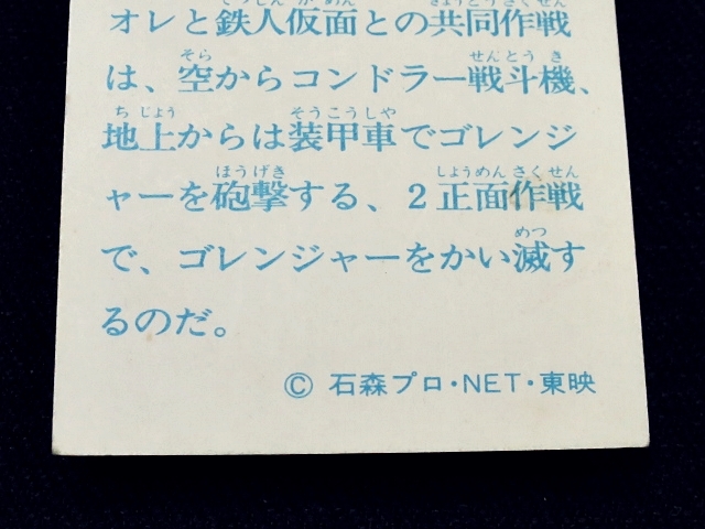 秘密戦隊ゴレンジャー ミニカード 70年代 バラ売り ・メーカー:山勝 ・1975年頃、当時の放送時に販売 ・6.6 cm x 5.0 cm ・同梱発送可能(複数落札の場合:定形、定形外郵便は、送料が変わる場合があります。) ・1-288番シリーズ ・1弾80種 001-080(タイトル違い.55.57.59.61.71.76.77,表修正.73) ・2弾32種 081-112 ・3弾64種 113-176 ・4弾48種 177-224 ・5弾32種 225-256 ・6弾32種 257-288 〓参考項目〓 ・原作:石森章太郎 ・脚本:上原正三 他 ・監督:竹本弘一 他 ・制作:テレビ朝日 ・放送期間:1975年4月- 1977年3月 ・全84話 〓出演〓 ・海城剛・アカレンジャー:誠直也 ・新命明・アオレンジャー:宮内洋 ・大岩大太・キレンジャー:畠山麦 ・熊野大五郎・2代目キレンジャー:だるま二郎 ・ペギー松山・モモレンジャー:小牧りさ ・明日香健二・ミドレンジャー:伊藤幸雄 ・江戸川総司令:高原駿雄 ・陽子・007:鹿沼えり ・黒十字軍総統:安藤三男、八名信夫 ・ナレーション:田中信夫、大平透 |