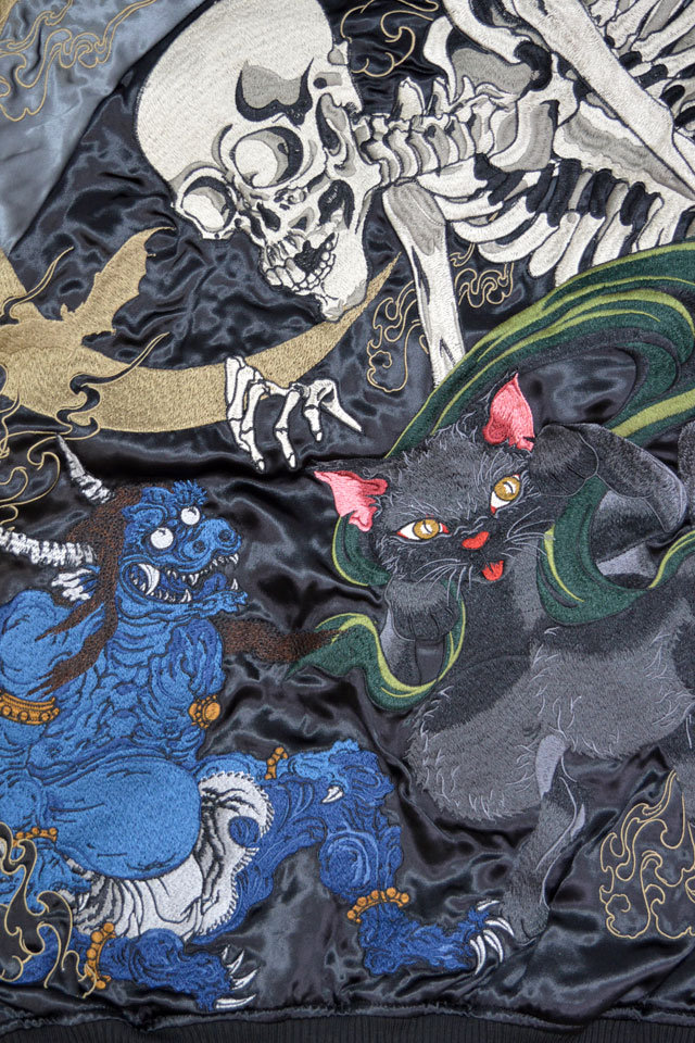 絡繰魂さんから「粋 百鬼夜行リバーシブルスカジャン(251004)」のご紹介です。 重みを感じる程の刺繍量が魅力的な絡繰魂から、最新作のスカジャンが登場しました。 今回モチーフの主役に採用されたのは、珍しい百鬼夜行柄。 また、今回のスカジャンはリバーシブル仕様になっています。 ボディーにはレーヨンサテンを使用し、ドレープや陰影がくっきりと現れています。 | ||||||||||||||||||||