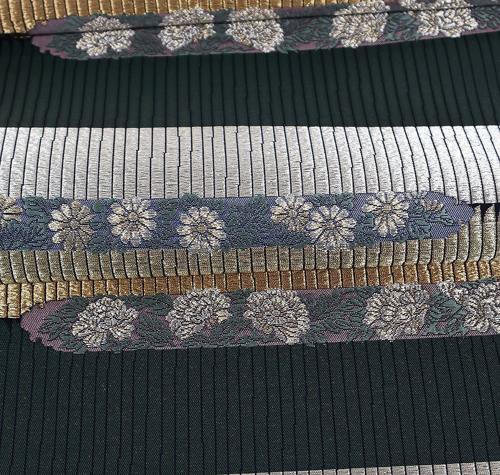 西陣織袋帯 鎧段文 金・銀・緑・縞地 鎧段文文 桜・牡丹・菊・霞文 (写真では上手く色が出ない場合があります。ご了承下さい) ※お使いのディスプレイの種類や設定の差により 実物の色と画像の色が少々異なることもございます。 |