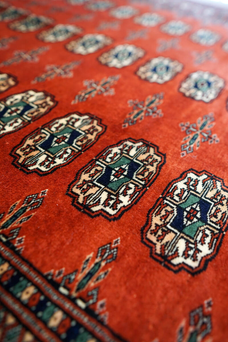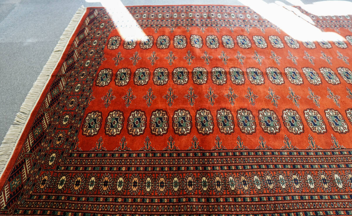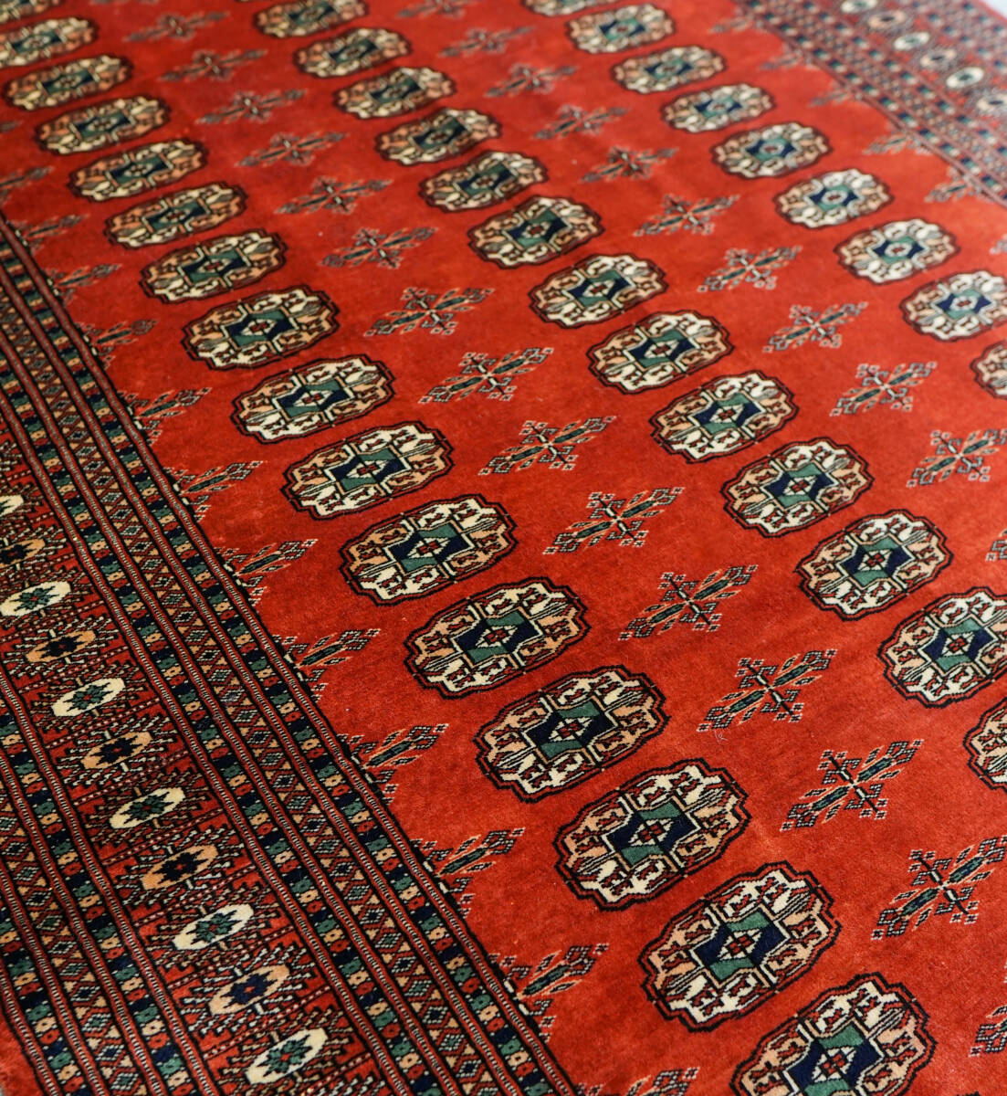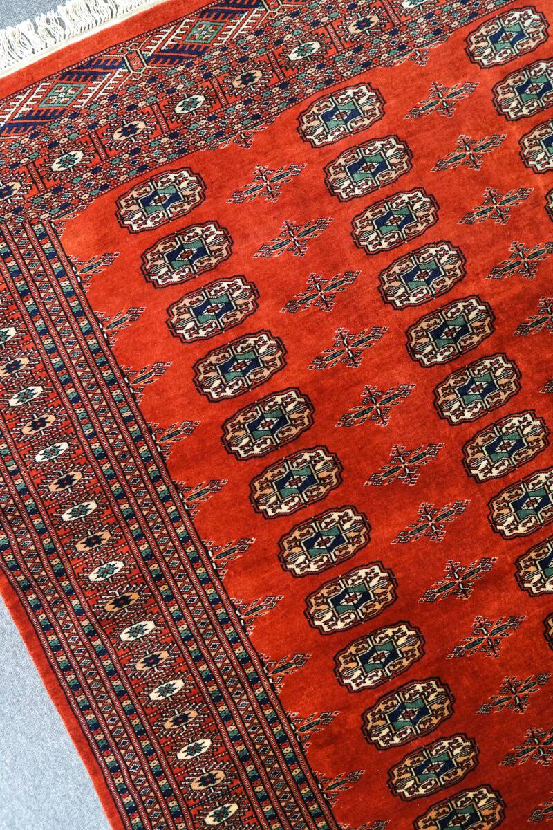 パキスタン絨毯で人気の『Bokhara(ボハラ)』は、トルクメニスタンの国旗にも使われている由緒ある柄で、象の足跡をモチーフにしています。