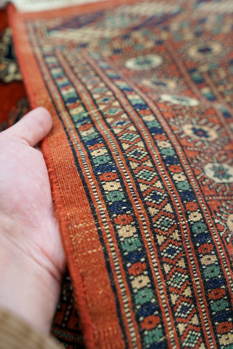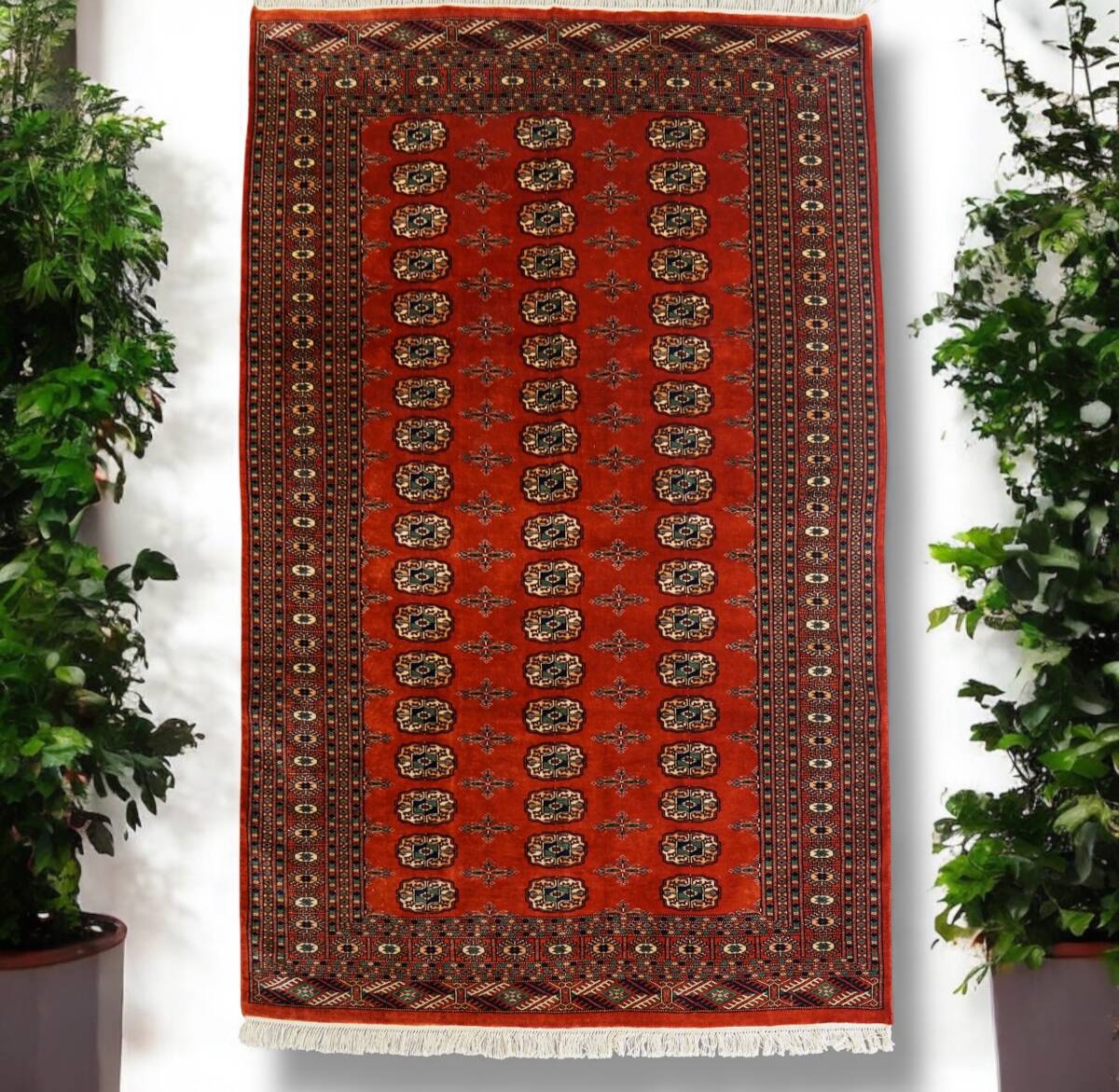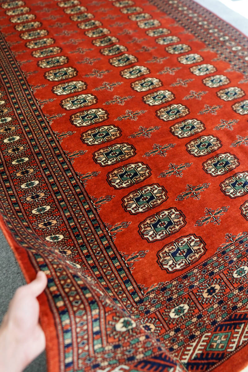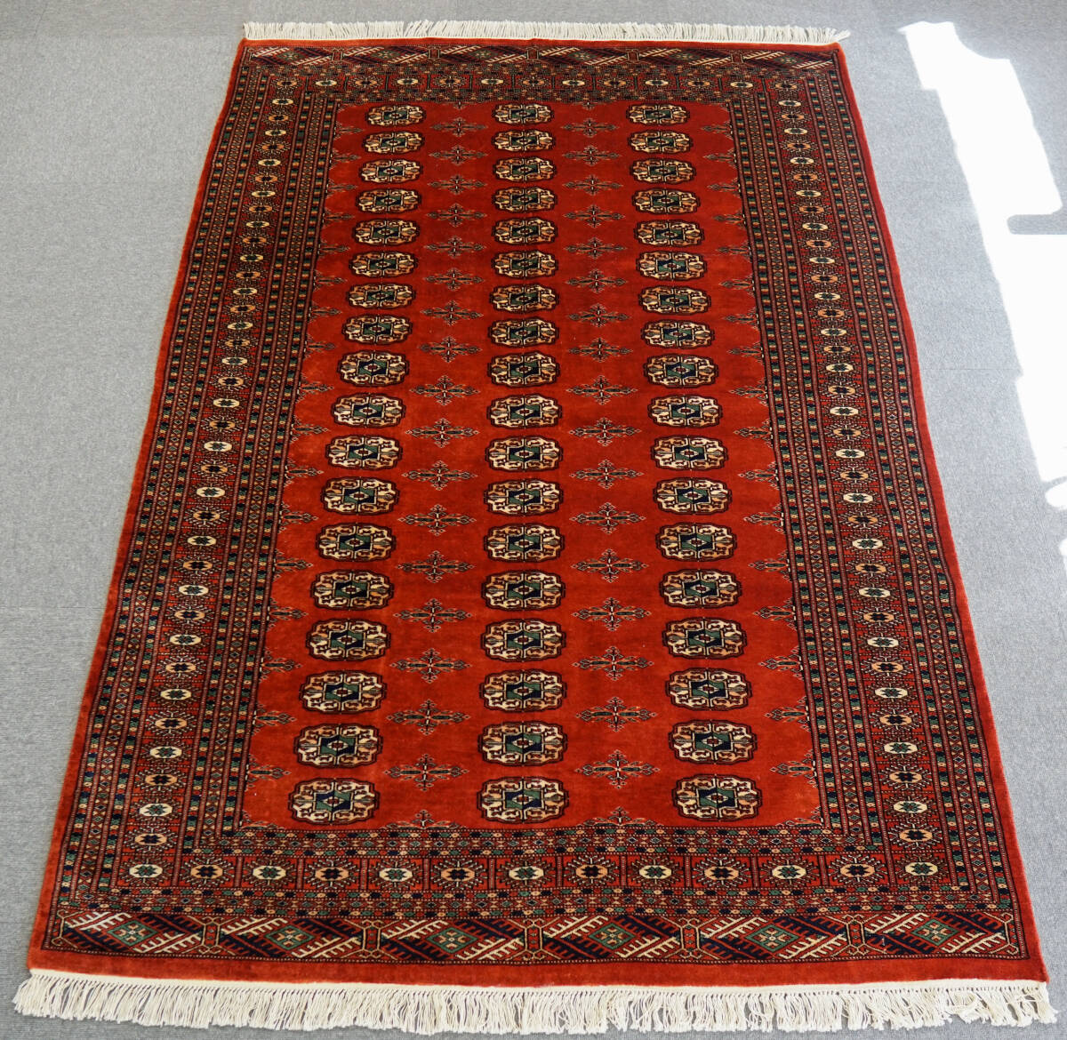 パキスタン絨毯で人気の『Bokhara(ボハラ)』は、トルクメニスタンの国旗にも使われている由緒ある柄で、象の足跡をモチーフにしています。