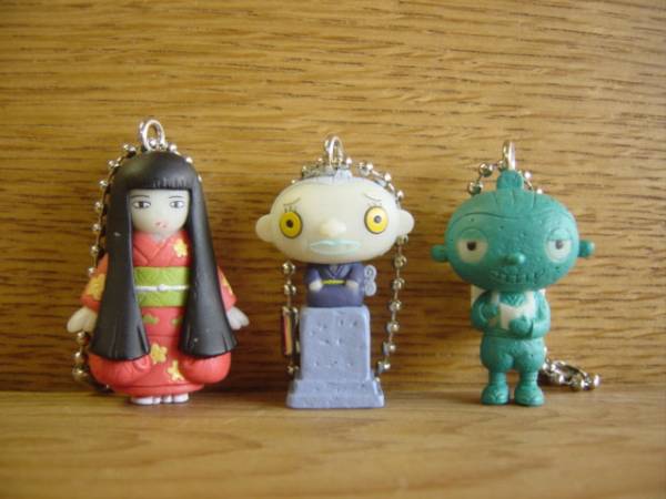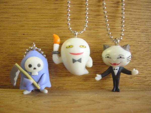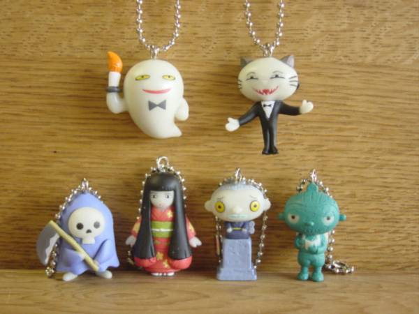 1.お化けギャルソン 2.ばけねこさん 3.メカ金次郎 4.死神さん 5.おきくちゃん 6.ゼンマイばーさん ◇暗闇でぼわんと光る蓄光スイング! 本編でも主人公がランドセルにキーホルダー をつけたりと番組連動アイテムです! |