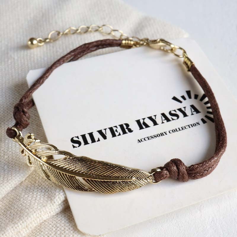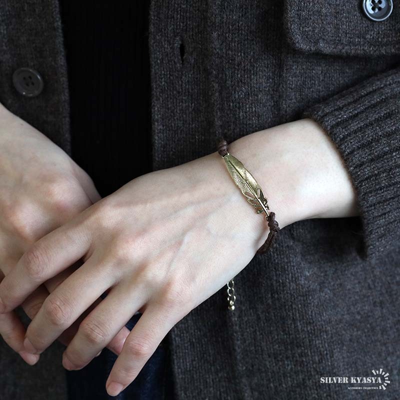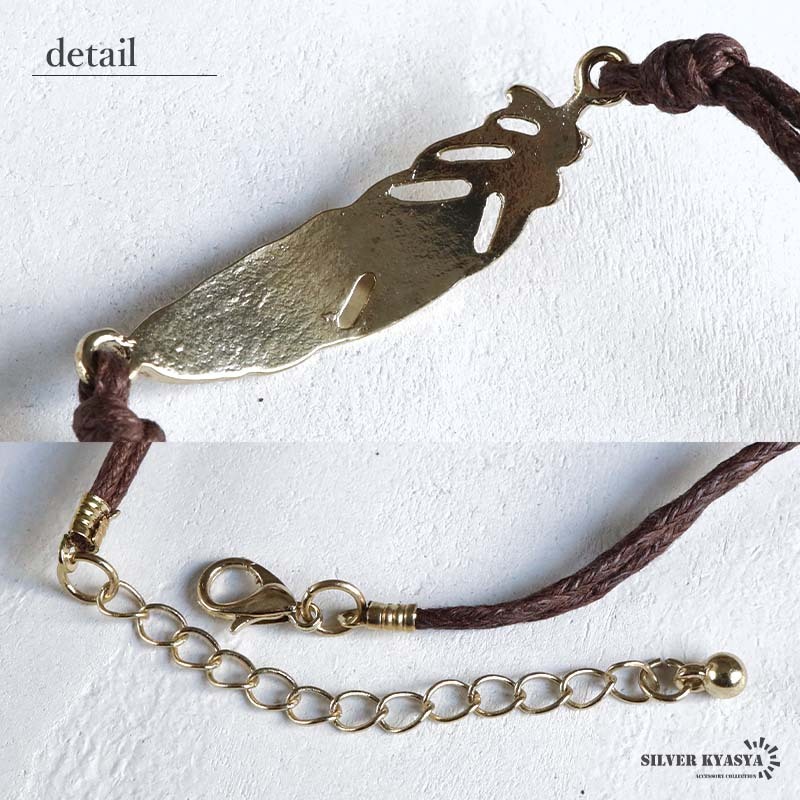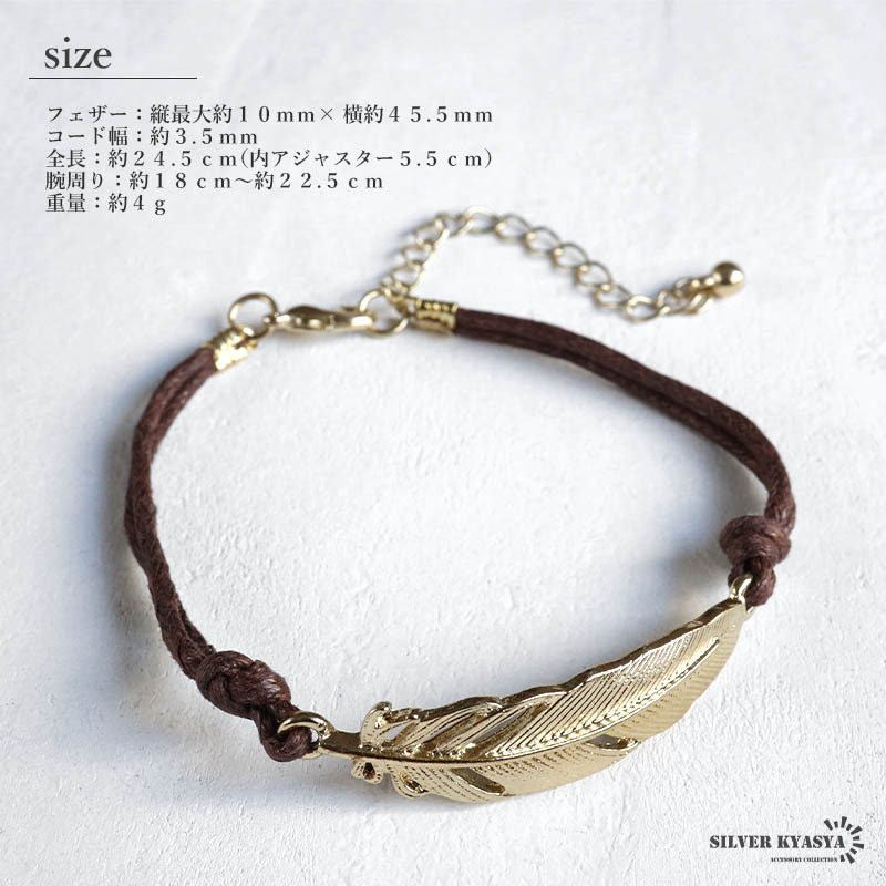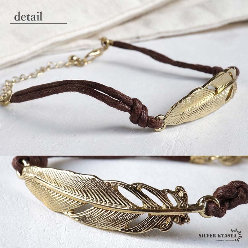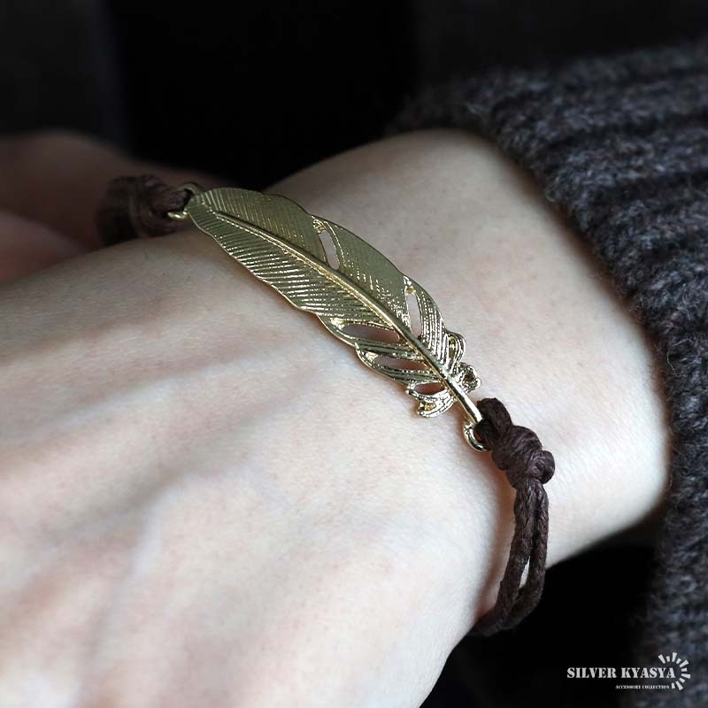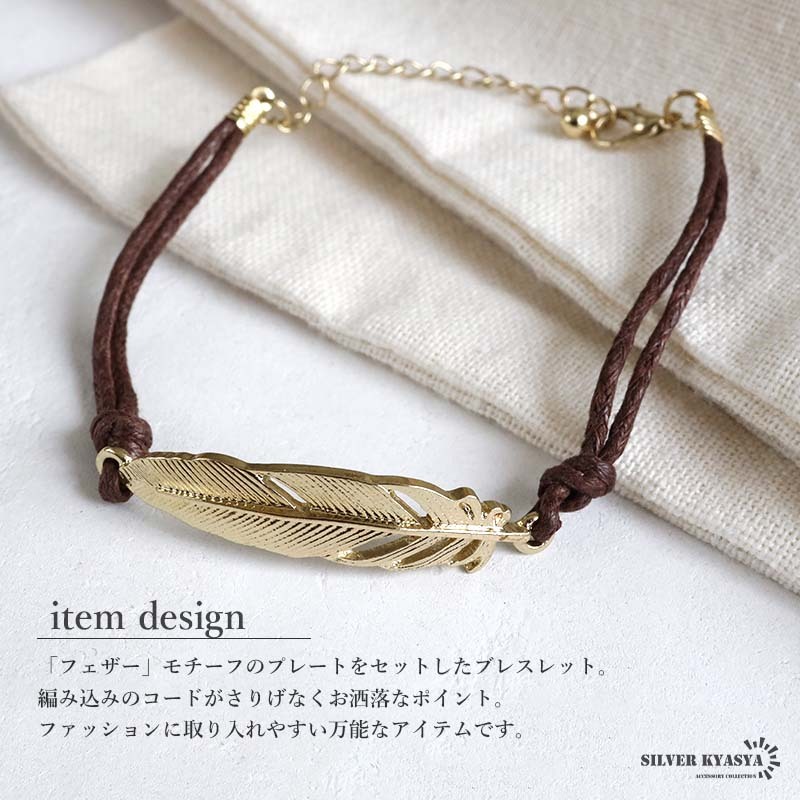 コードブレスレット フェザーブレスレット 紐 ヒモ ブラウン 編み込み 羽根 プレート カジュアル お洒落 女子 レディース