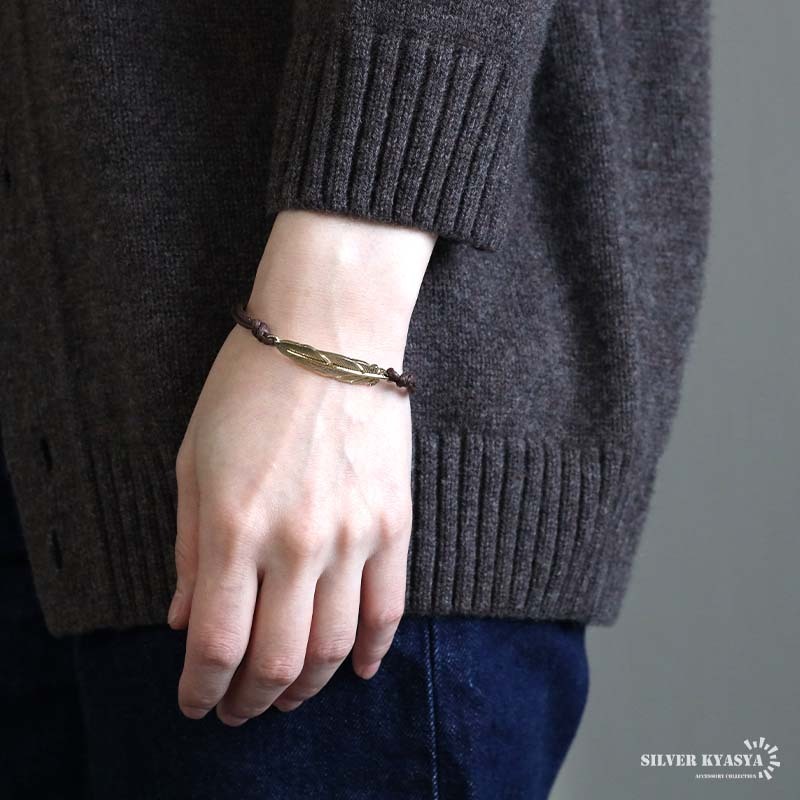 「フェザー」モチーフのプレートをセットしたブレスレット。編み込みのコードがさりげなくお洒落なポイント。ファッションに取り入れやすい万能なアイテムです。