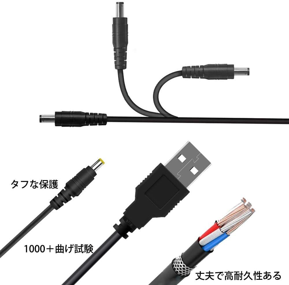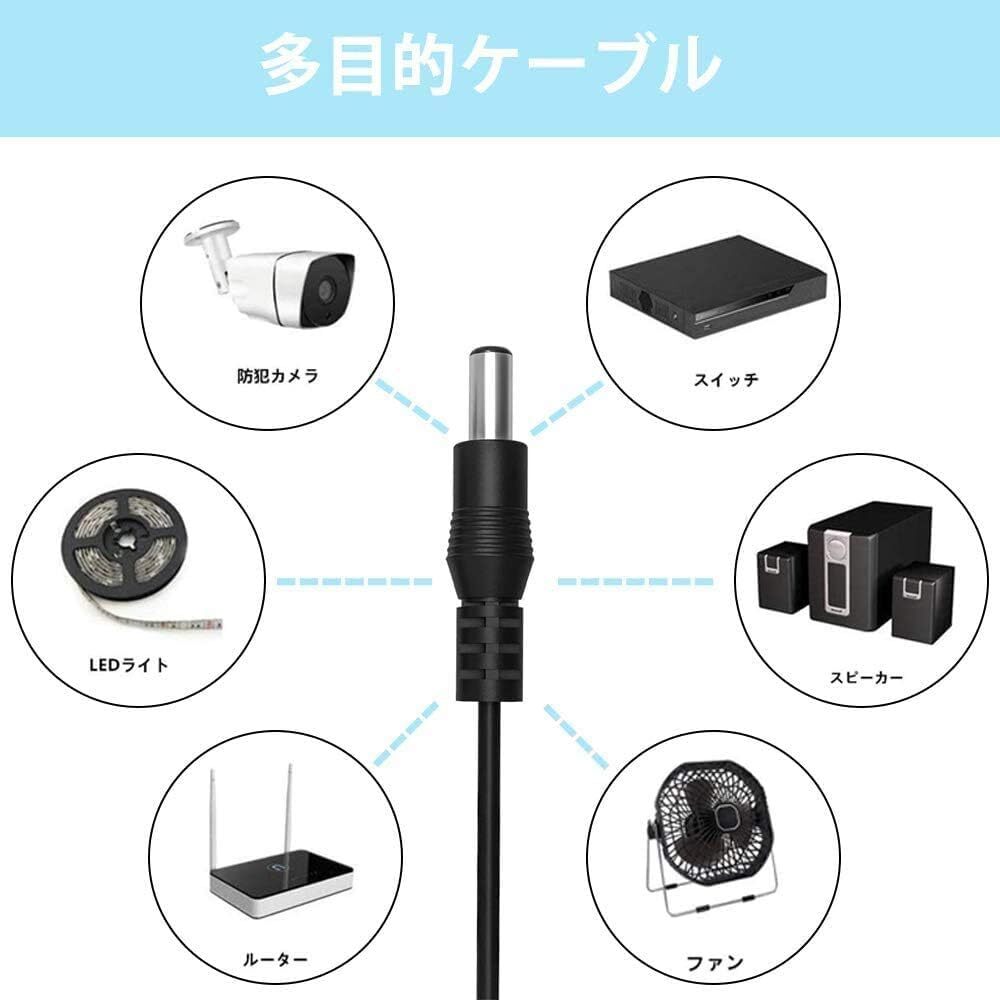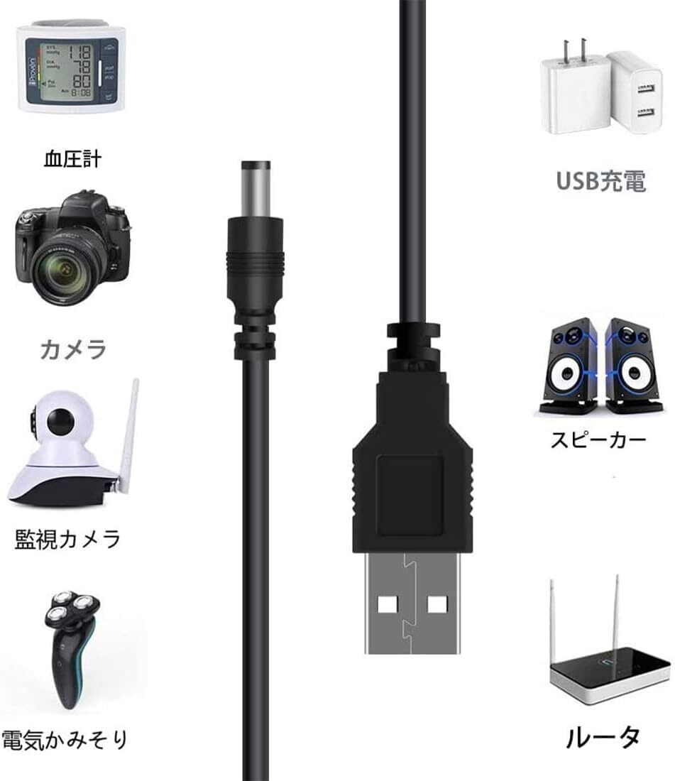 1、USB電源ケーブル: USB DC変換ケーブルです。USB 5V/1.2AタイプオスからDC端子(外径5.5mm/内径2.1mm)への充電用ケーブルです。機器をモバイルバッテリーから充電して、持ち運びに便利です。また、丸端子対応のUSB変換プラグが付属しており、様々な機器への相互利用が可能です。【ご注意】USB DCケーブルは最大5V/1.2Aの負荷電流に対応しています。DCコネクタは5V/1.2A Maxに対応しています。