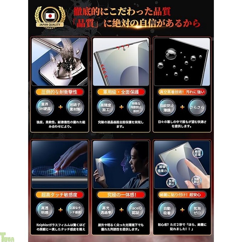 日本AGC社製の旭硝子を採用し通常ガラスと比べ強度、耐傷性、質感のすべてにおいて優れた性質を持ち一般的なガラスに比べ約6倍の表面強度を持ち衝撃を緩和、画面へのダメージを最小限まで抑えすり傷などの細かい傷やベタつく指紋から画面をしっかりと保護します。