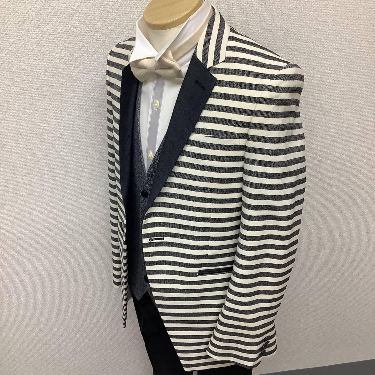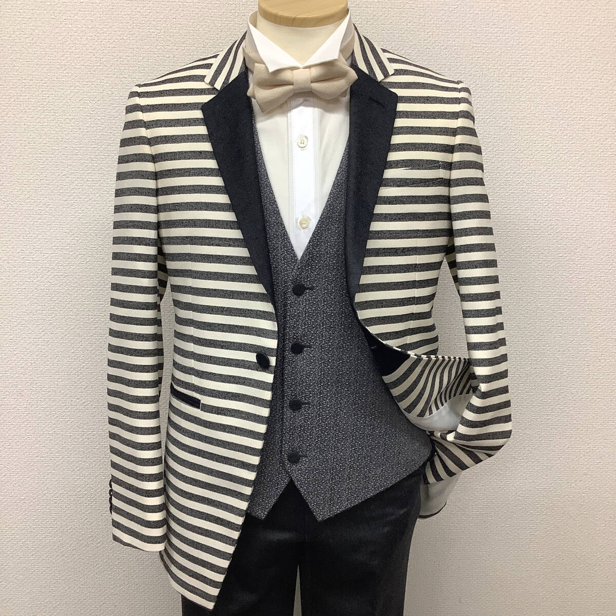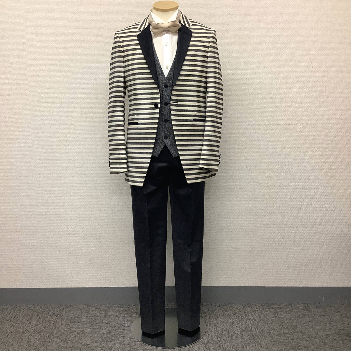 A-Sサイズ★オフ白とグレーのボーダー柄の上衣★毛織風合いのベスト、パンツはチャコールグレー、オフ白の蝶タイ付(マツオ)