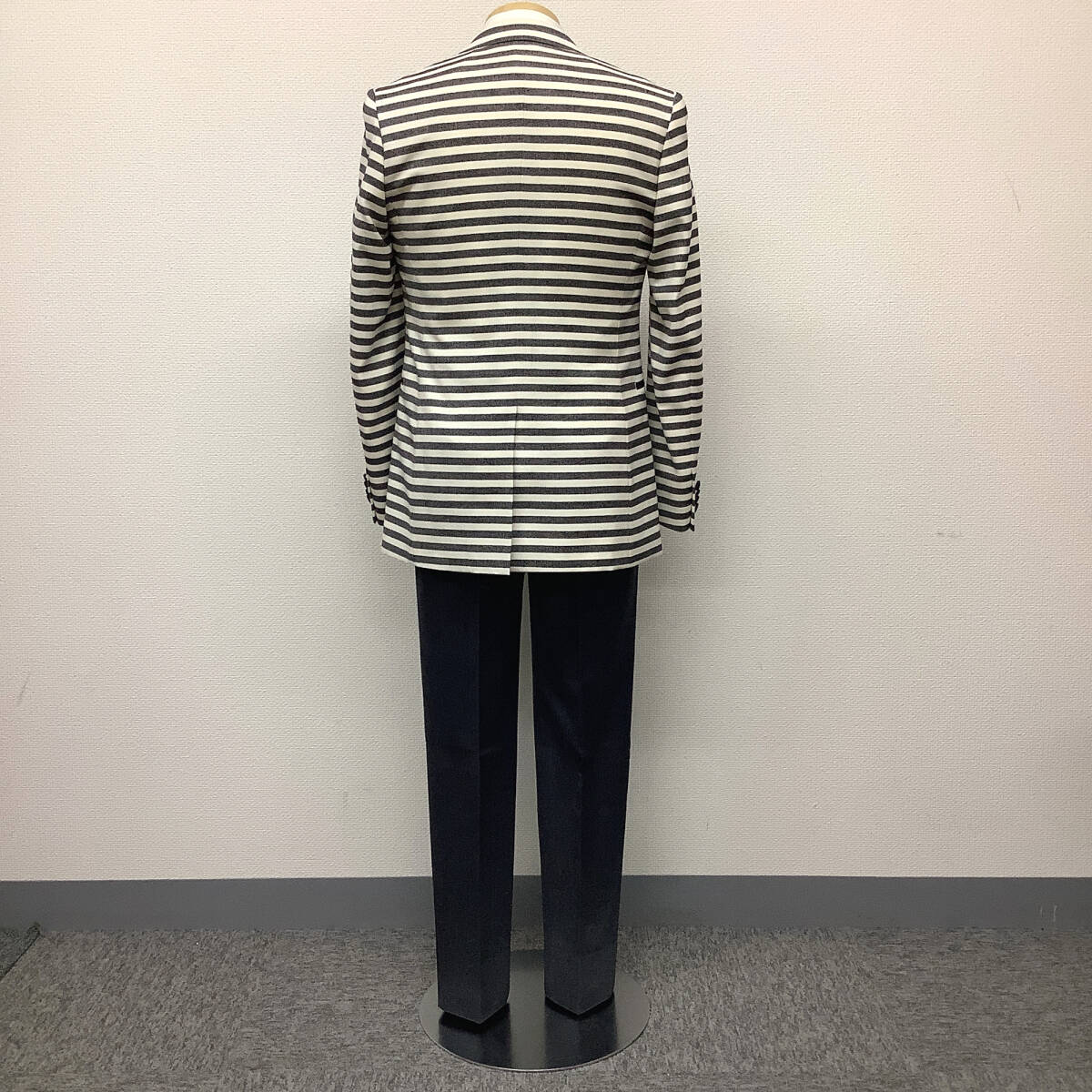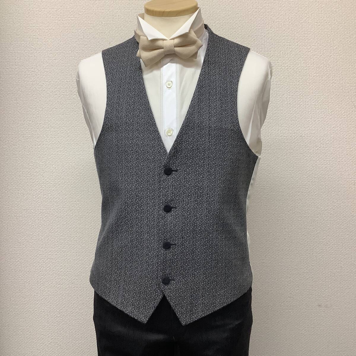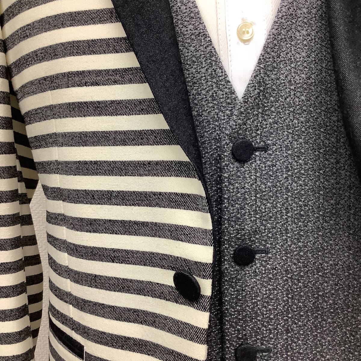 A-Sサイズ★オフ白とグレーのボーダー柄の上衣★毛織風合いのベスト、パンツはチャコールグレー、オフ白の蝶タイ付(マツオ)