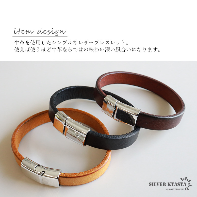商品概要 | ■ITEM DETAIL 牛革を使用したシンプルなレザーブレスレット。使えば使うほど牛革ならではの味わい深い風合いになります。 ■3カラー展開 ブラック、ブラウン、キャメル、普段使いしやすい3タイプを取り揃えております。 |