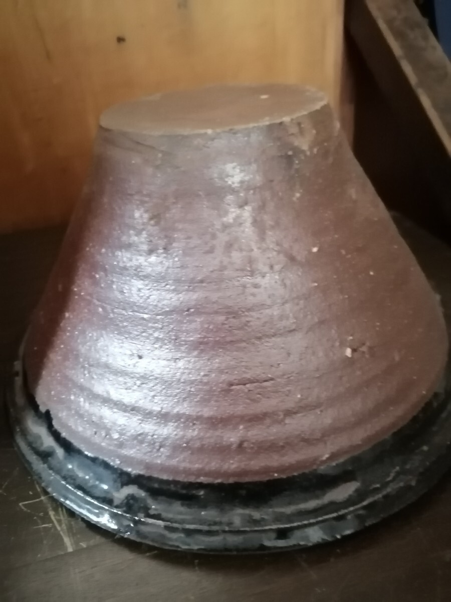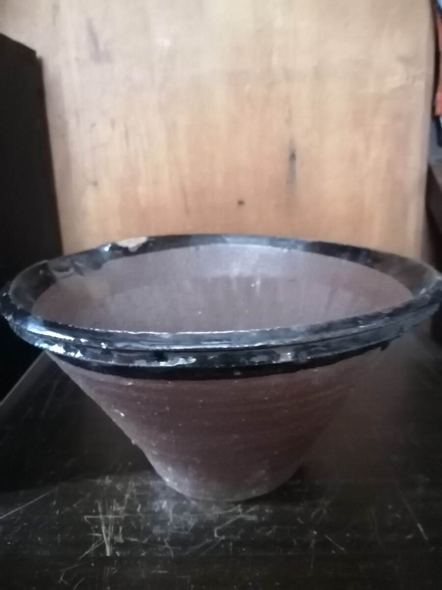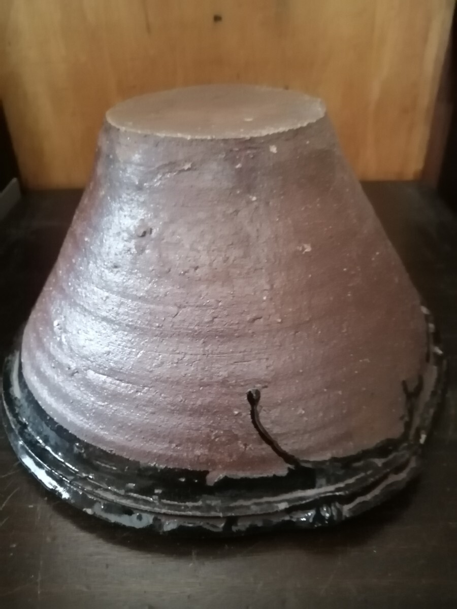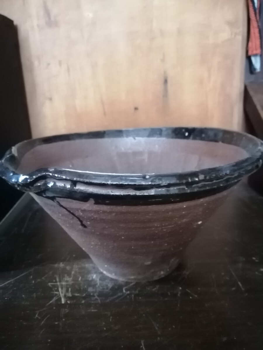 江戸後期の編笠型の摺鉢です。東北地方の焼き物と思われ、独特の姿をしています。口辺に鉄釉を掛け焼締められています。