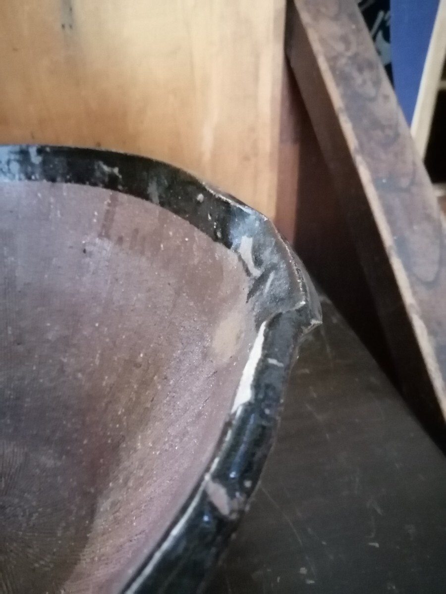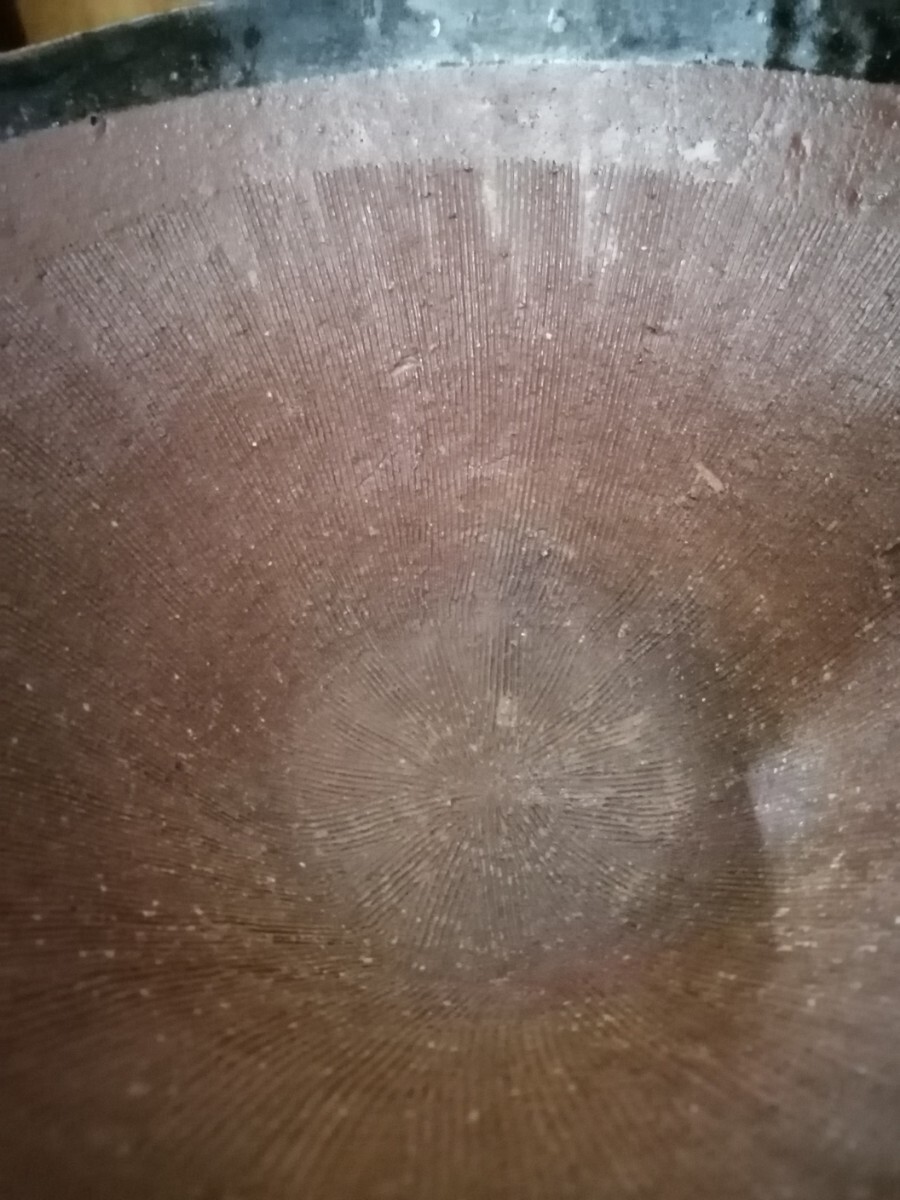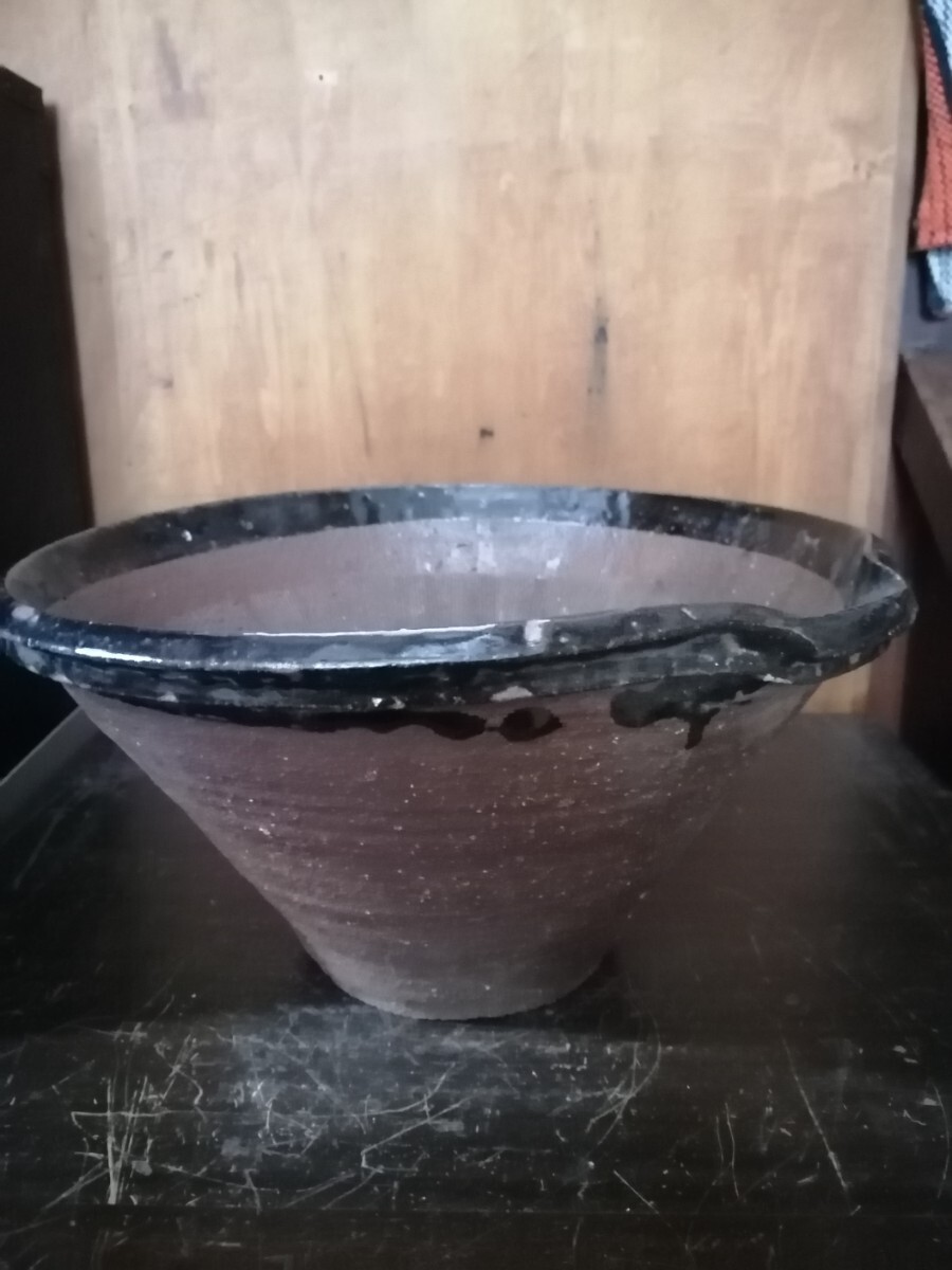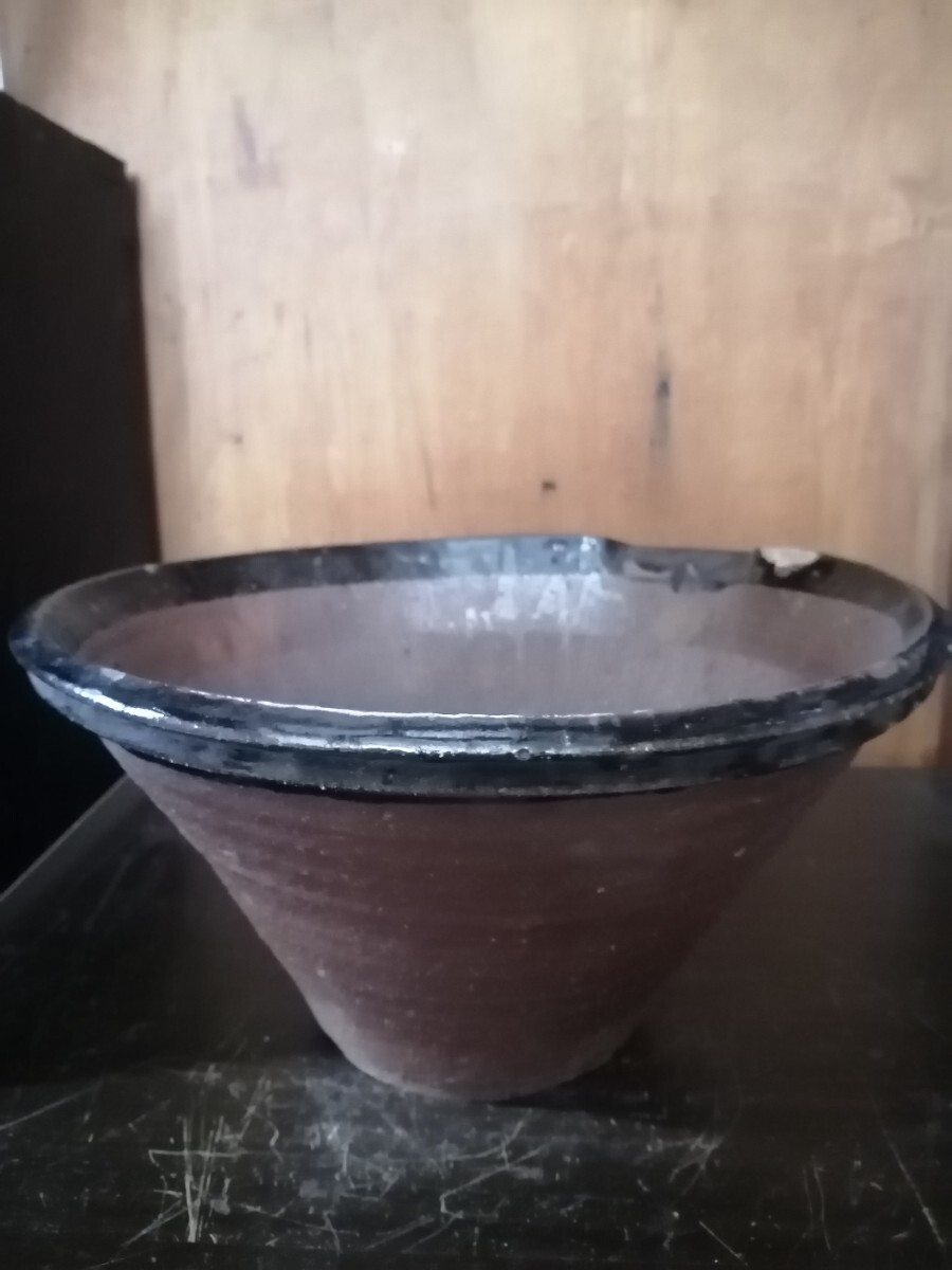江戸後期の編笠型の摺鉢です。東北地方の焼き物と思われ、独特の姿をしています。口辺に鉄釉を掛け焼締められています。
